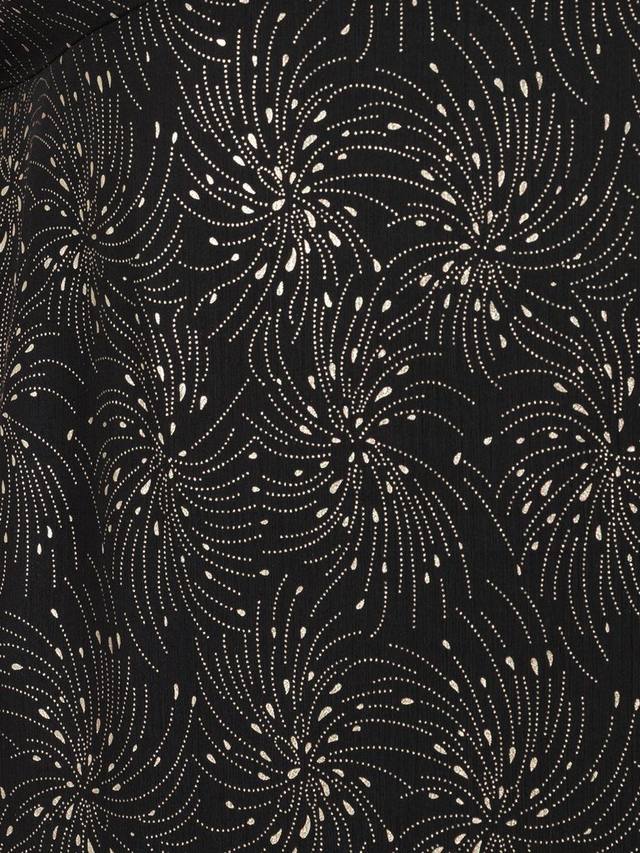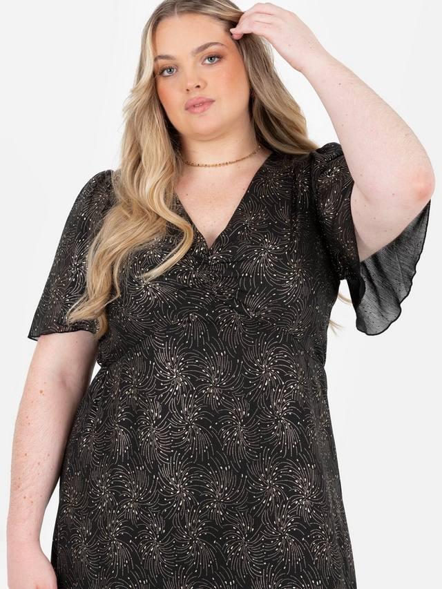 Это платье из лёгкой струящейся ткани с завышенной талией, V-образным вырезом, рукавами-ангелами и принтом в виде фейерверка. Ниспадающие оборки на юбке мидакси добавят грациозности и сделают образ грациозным для вечерних мероприятий.