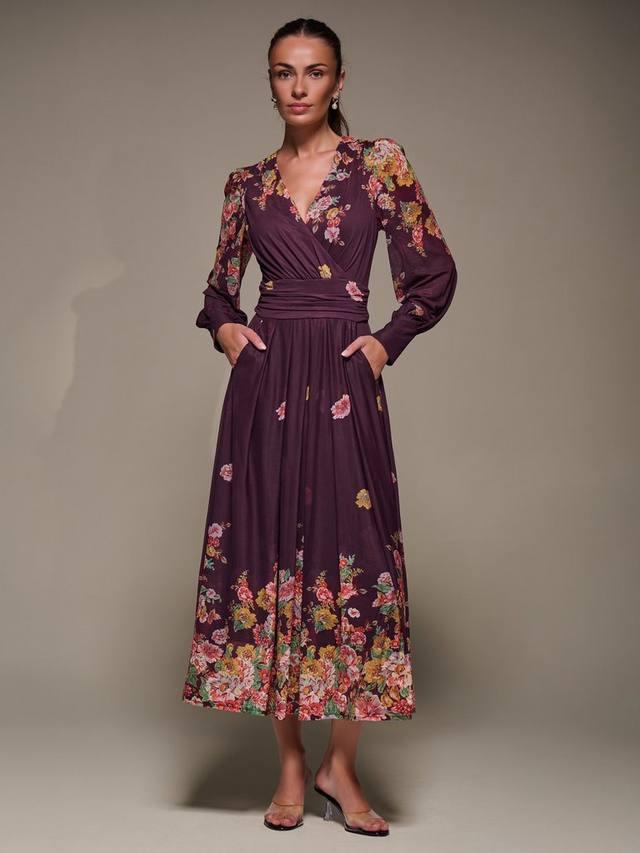 Это длинное платье макси с длинными рукавами от Jolie Moi, дополненное V-образным вырезом и цветочным принтом, создает эффект движения.