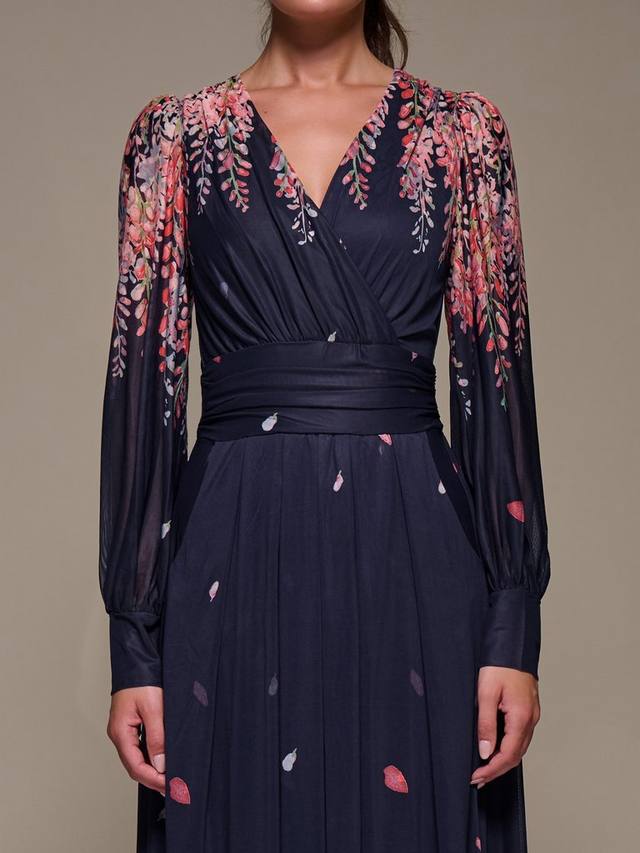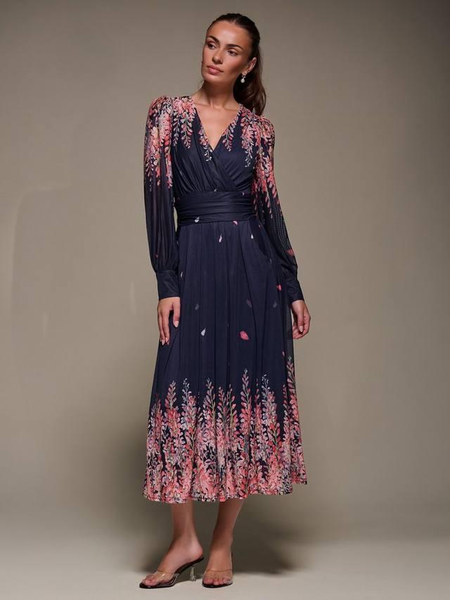 Это длинное платье макси с длинными рукавами от Jolie Moi, дополненное V-образным вырезом и цветочным принтом, создает эффект движения.