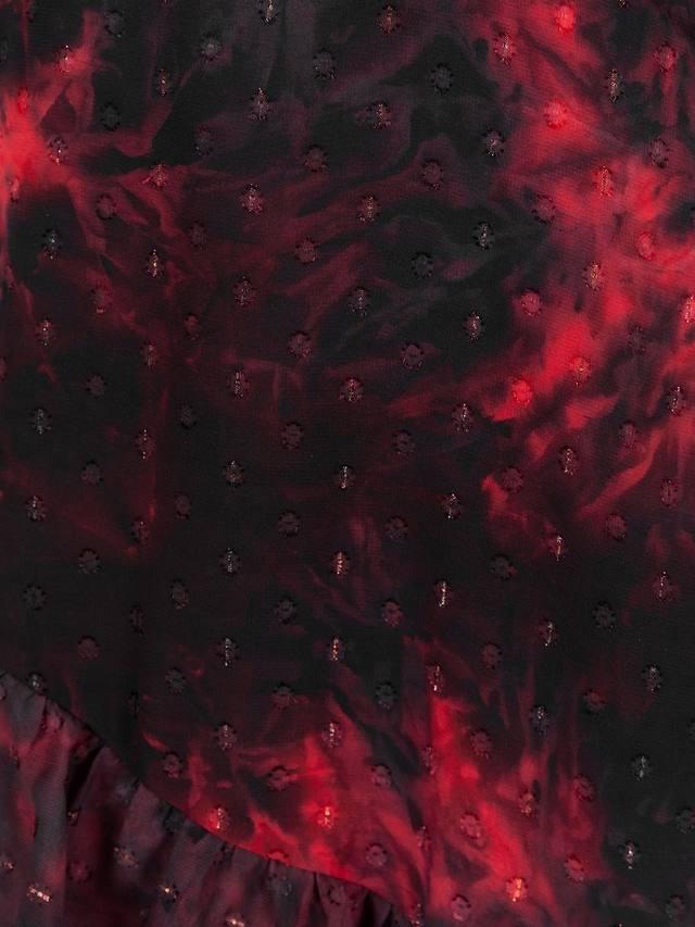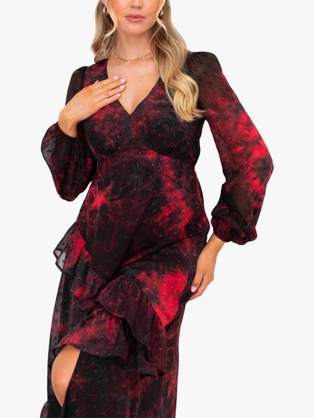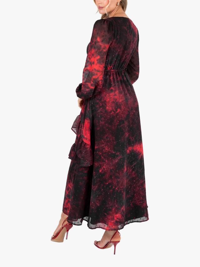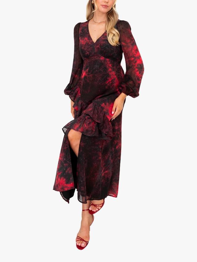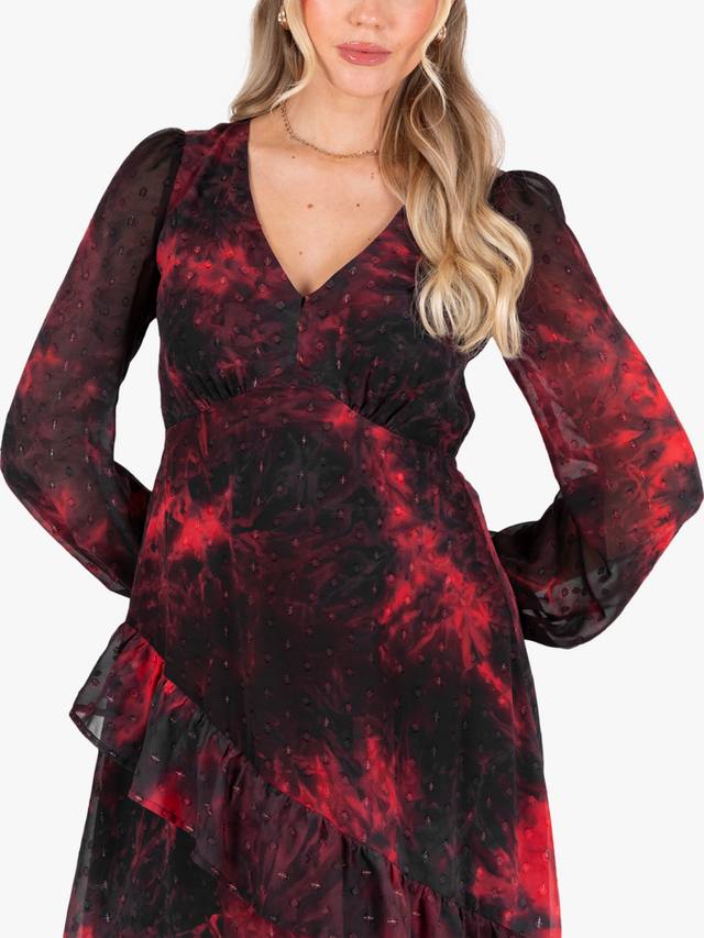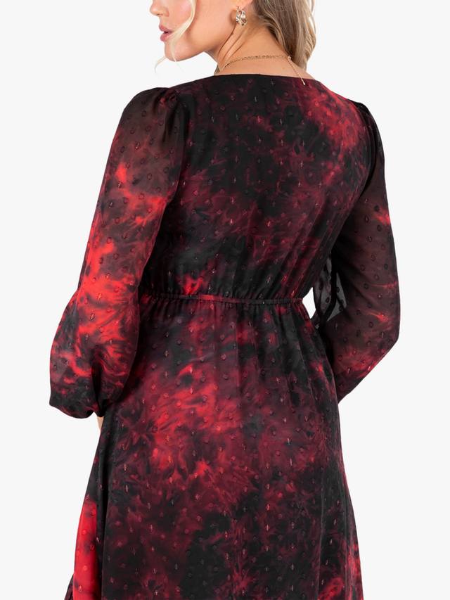 На первый взгляд это платье с цветочным принтом кажется простым, но присмотритесь внимательнее и обнаружите роскошные детали: выжженная текстура добавляет глубины цветам, а приподнятый V-образный вырез с бантом, имитация пуговиц и сборка на талии придают винтажный шарм. Юбка с разрезом спереди завершает образ.