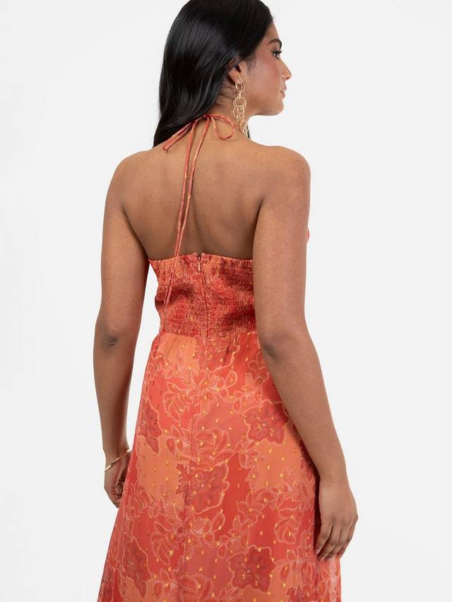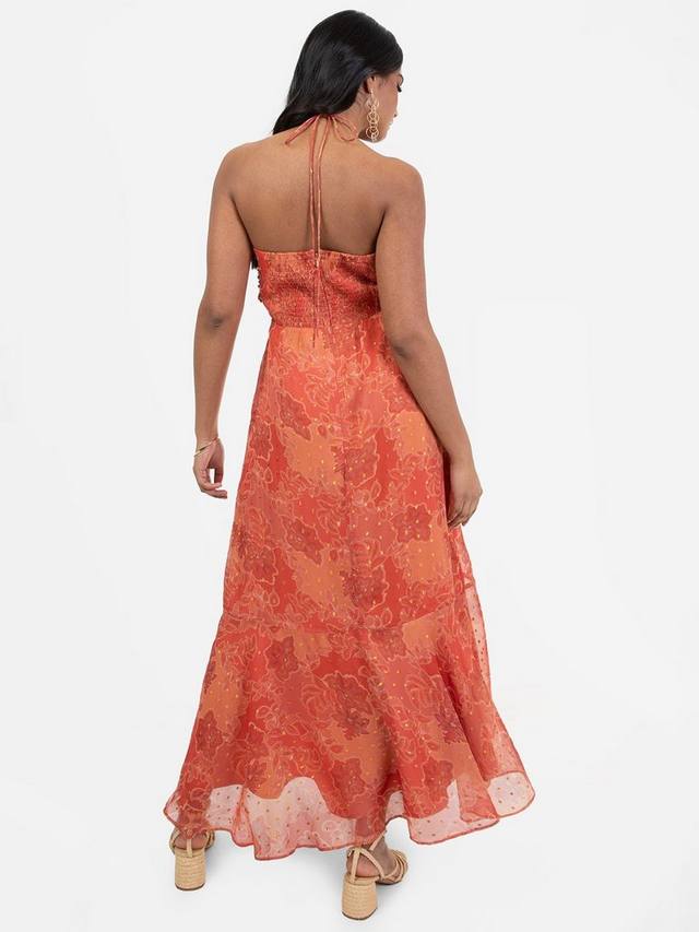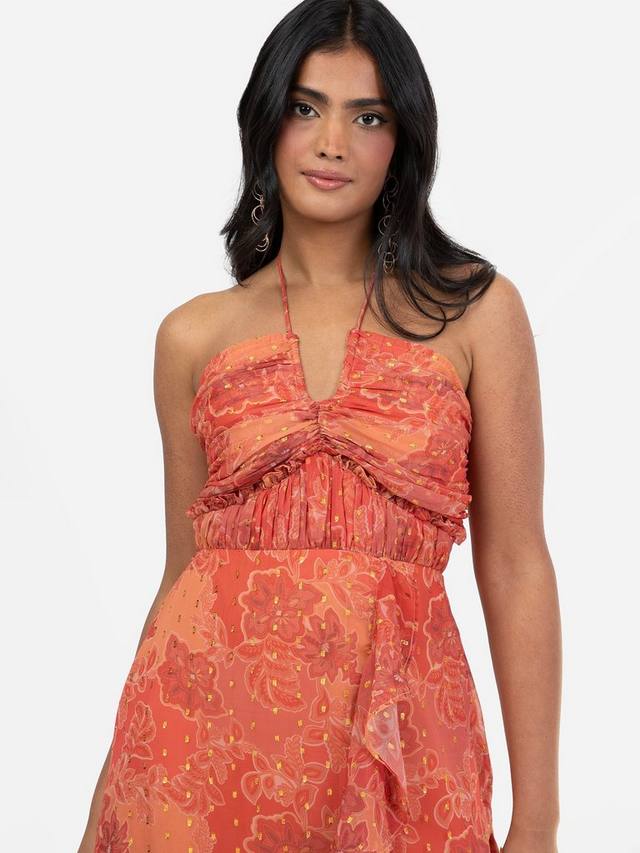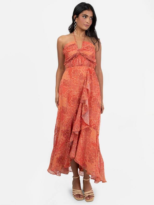 Это платье из лёгкого шифона с нежным цветочным принтом в стиле ретро отличается привлекательным лифом с рюшами и регулируемым халтер-лифом, а мерцающие нити добавляют ему очарования. Асимметричные оборки красиво переходят в оборчатый асимметричный подол, создавая струящийся силуэт, который грациозно движется. Это платье миди идеально подходит для свадеб, летних вечеров или романтических выходов. Оно прекрасно сочетается с туфлями на каблуке с ремешками и эффектными серьгами.