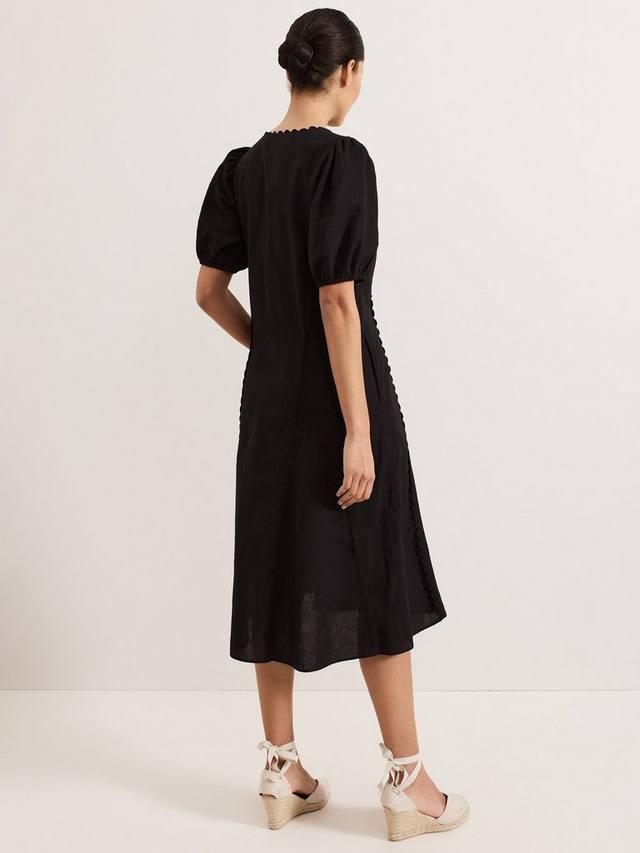 Это платье, дополненное фестончатыми деталями и рукавами-буфами для создания объёма, дополнено потайными карманами, что придаёт ему современный вид. Оно достаточно универсально и подходит как для дня, так и для вечера, и гарантированно станет вашим любимым нарядом.
