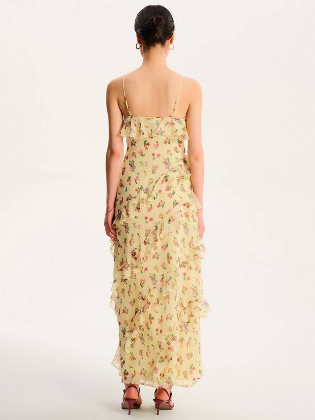 Мечтательное и романтичное платье Missy сшито из лёгкого шифона. Это миди-платье с каскадными оборками, украшенное цветочным принтом, одновременно весёлое и элегантное. Тонкие бретельки и подчеркивающий фигуру V-образный вырез создают свободный силуэт, который идеально подходит для теплых дней, будь то наряд для мероприятия или неформального завтрака.