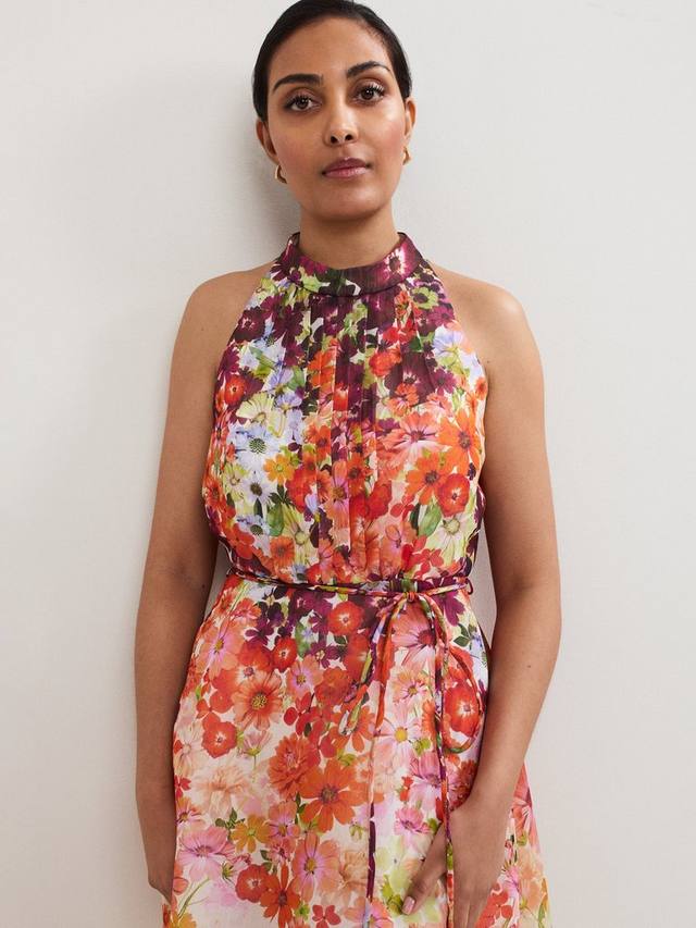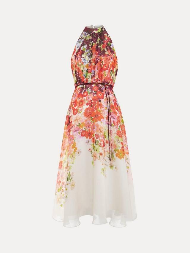Это эффектное платье с американской проймой, сочетающее классический силуэт и современный цветочный принт, создано в стиле халтер. Оттенки, подчеркивающие естественность движения юбки, добавят элегантности классическим каблукам и простому клатчу.