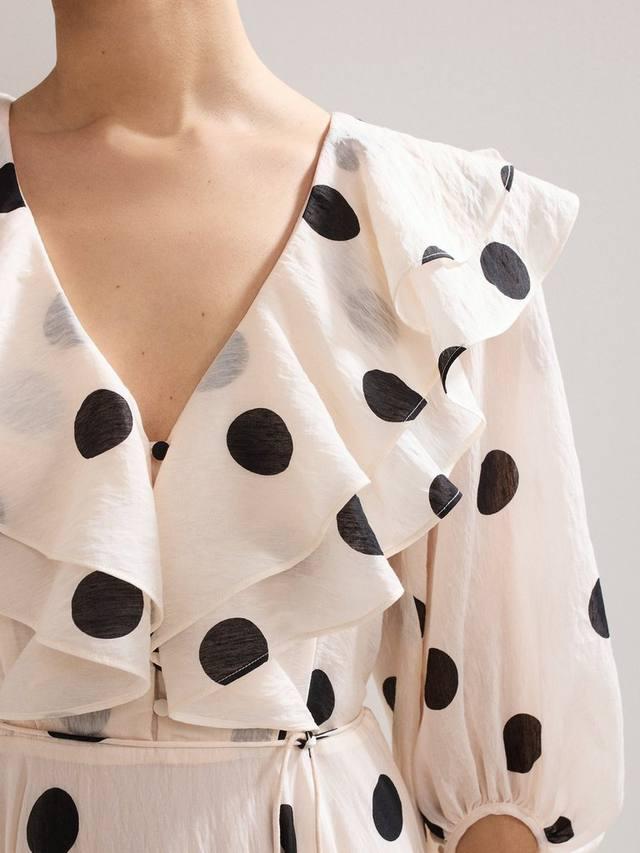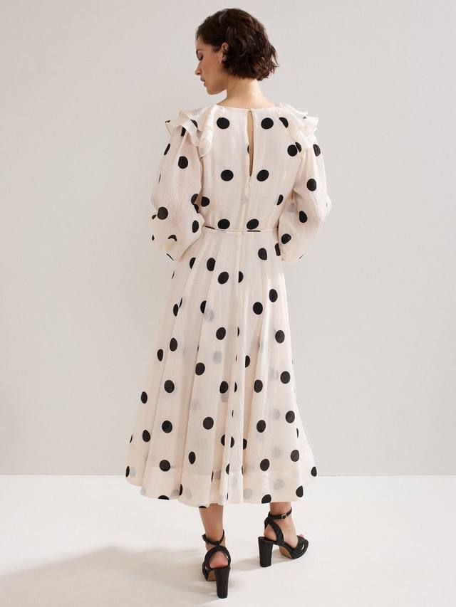 Это платье в горошек, неподвластное времени, — яркий и запоминающийся образ для торжественных случаев. Красивые оборки и рукава-блузон придают силуэту объём, переходя в пышную юбку миди, которая обеспечивает плавность движений. Дополните принт аксессуарами, чтобы создать изысканный наряд, который подойдёт как для скачек, так и для свадьбы.