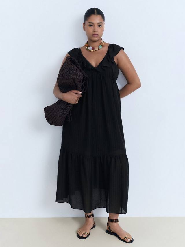 Это платье миди Mango обеспечит комфорт и уверенность благодаря многоуровневым полоскам, V-образному вырезу и квадратной спинке. Лёгкое и удобное, оно идеально подходит для ярких дней и тёплых, энергичных встреч.