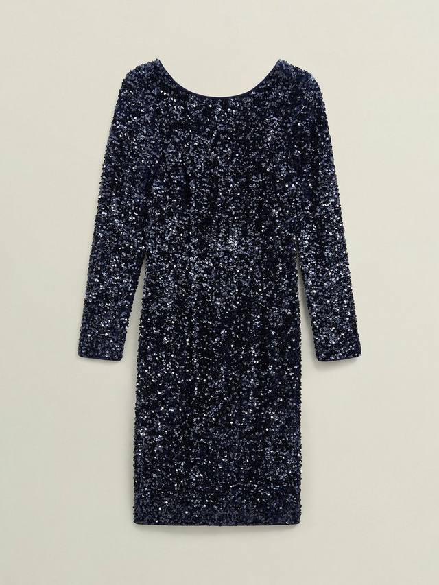 Пайетки по всей поверхности. Подкладка для комфорта. Элегантный вырез лодочкой и укороченная спинка. Длина чуть выше колена. Длинные рукава.