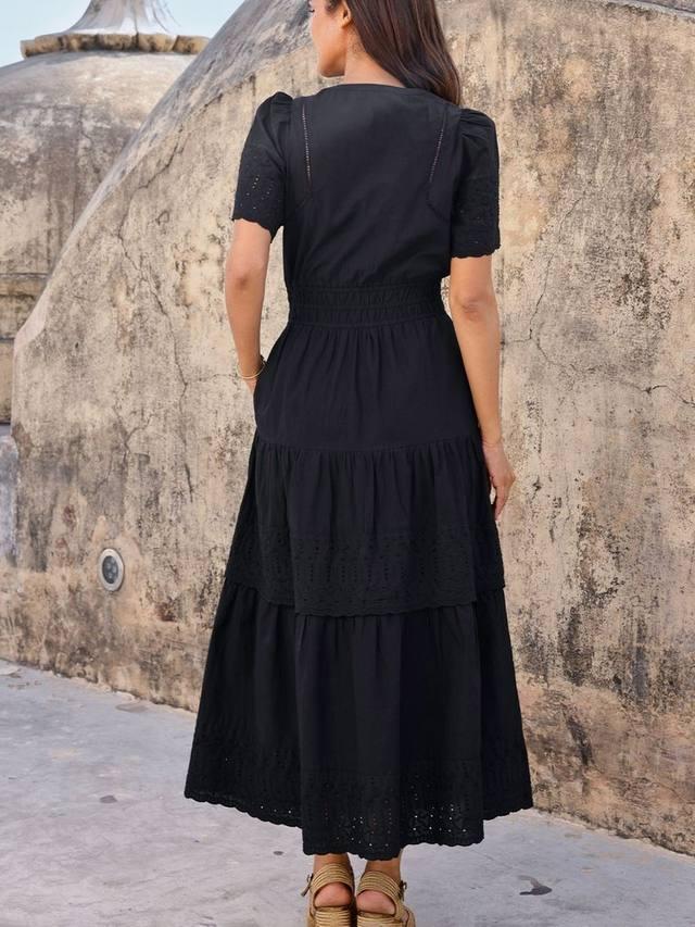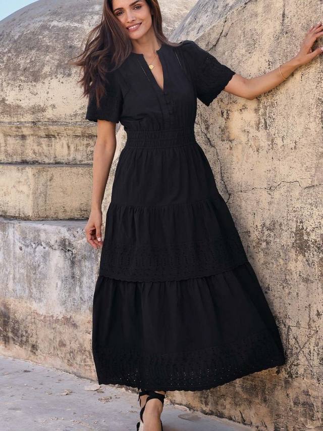 Это макси-платье от Aspiga, скроенное по силуэту, вдохновленному чайным платьем, сшито из мягкого хлопка (органического, разумеется). Платье с V-образным вырезом и короткими рукавами, подчеркивающими фигуру, украшено изысканной вышивкой.