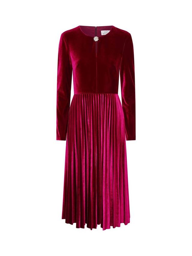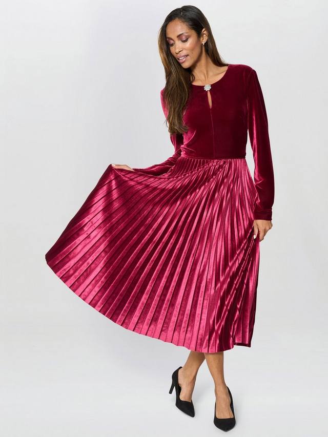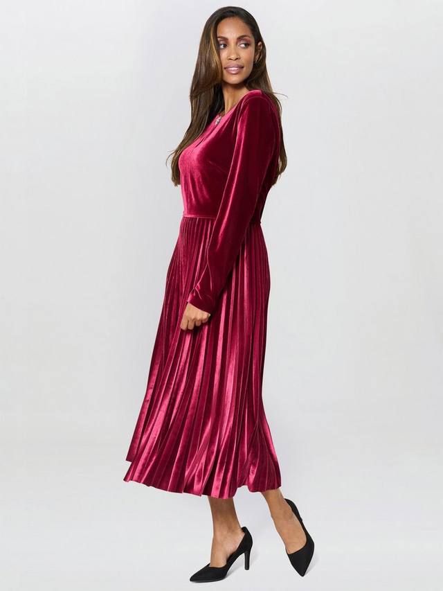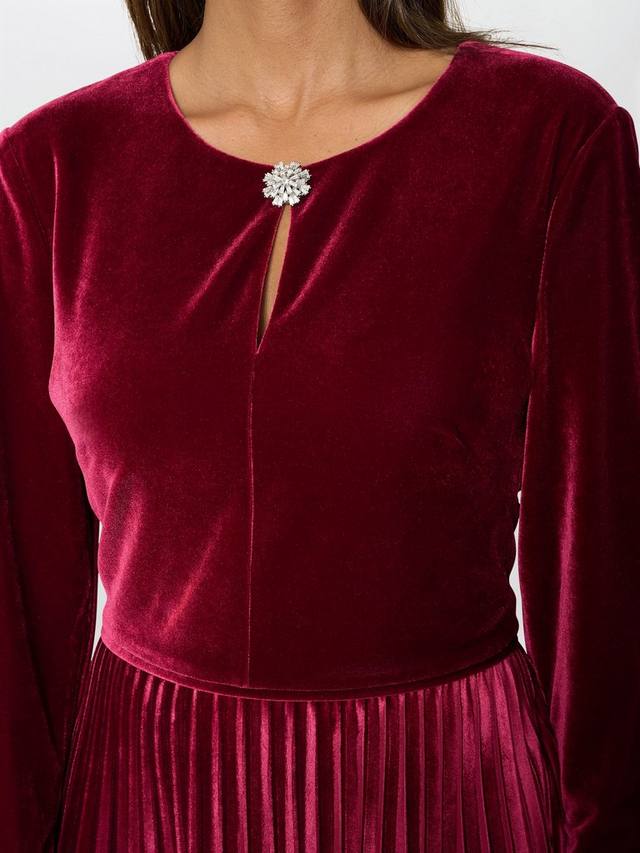 Это великолепное бархатное платье создано с учетом элегантности и изысканности. Оно дополнено V-образным вырезом с изящной замочной скважиной и длинными рукавами, создающими изысканный образ. Плиссированная юбка красиво играет светом, создавая прекрасный силуэт, идеально подходящий для вечерних мероприятий, свадеб или праздничных торжеств.