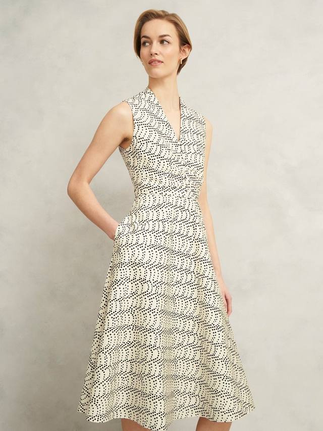 Фирменные пятна переосмыслены в современном платье Ruthie, скроенном с расклешенным силуэтом, который выглядит непринужденно шикарно.