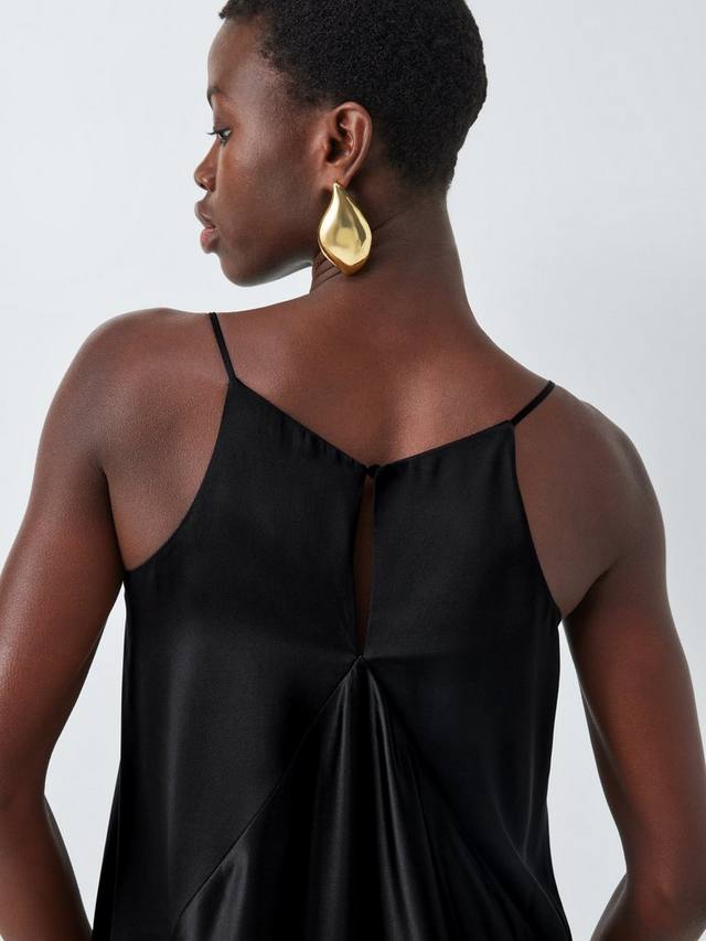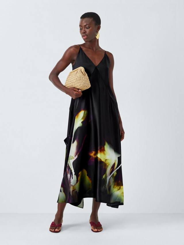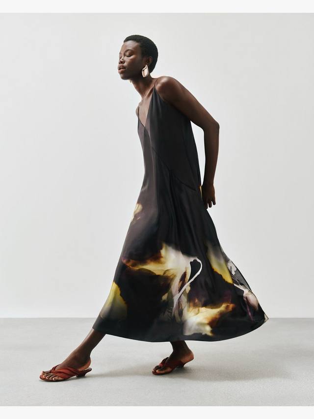 Платье без рукавов с панелями из чистого шелка. Роскошный вид и ощущение благодаря V-образному вырезу, тонким бретелькам и эксклюзивному цветочному принту, нарисованному вручную, который красиво расклешивается, достигая длины миди.