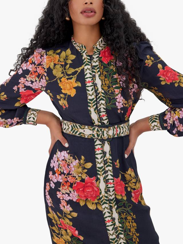 Это платье миди с цветочным принтом – воплощение непринужденного стиля. Платье имеет элегантный силуэт с длинными рукавами, застежку на пуговицы спереди и пояс с резинкой на талии, что придает ему элегантный вид. Мягкая вискозная ткань красиво драпируется, а яркий цветочный принт добавляет свежести и женственности. Идеально подходит как для повседневных выходов, так и для особых случаев.