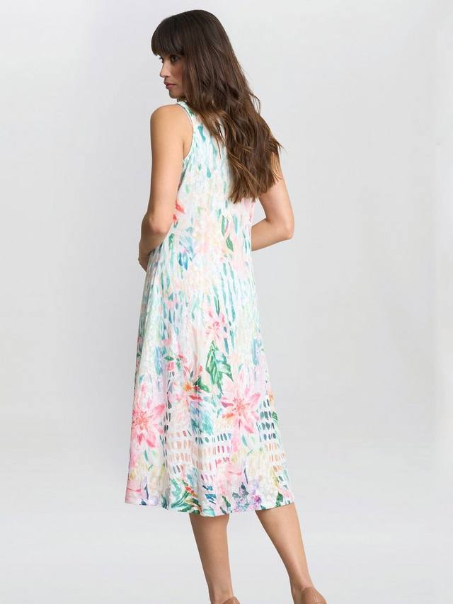 Это яркое и воздушное платье без рукавов украшено смелым принтом в тропическом стиле. В дизайне присутствуют нотки абстрактных текстур, что придает ему свежесть и летний вид. Платье имеет выгодный А-силуэт, струящийся и комфортный. Идеально подходит для мероприятий в теплую погоду, праздников и повседневных прогулок.