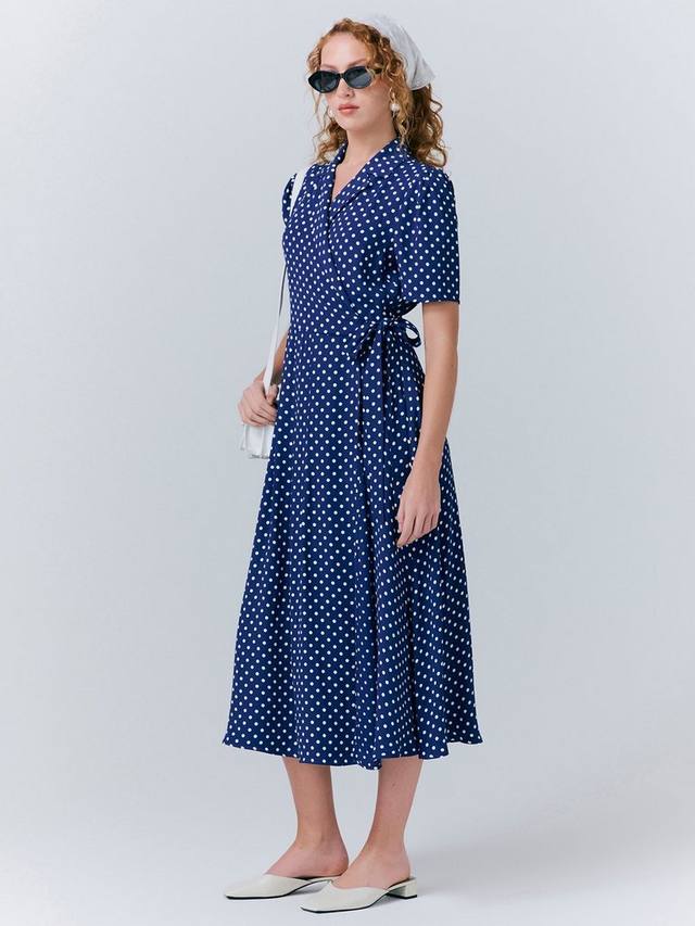 Это платье средней длины от Ghost, идеально подчёркивающее фигуру, сшито из лёгкой вискозы. Классический вариант благодаря вырезу на запах и коротким рукавам, а также узору в горошек, создающему ретро-стиль.