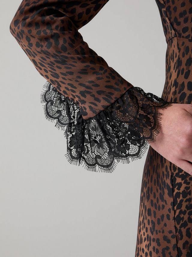 Платье Geena сочетает в себе классическую элегантность и анималистичный принт. Платье миди сшито из ткани с леопардовым принтом Dark Natural Multi, сертифицированной FSC, приталенного силуэта с расклешенной юбкой, кружевными рукавами и привлекательным вырезом-хомутиком. Креп с атласной изнанкой добавляет лёгкое сияние, а длинные рукава создают изысканный образ. Идеально подходит для летних вечеров или особых случаев. В сочетании с золотыми аксессуарами и туфлями на каблуке с ремешками это платье создаёт непринуждённый гламурный образ. Этот ансамбль вне времени для любого элегантного летнего случая.