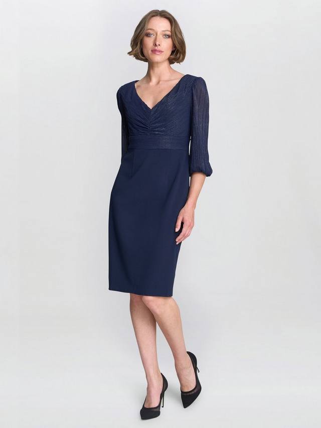 Это платье – ваш идеальный выбор для изысканного вечернего образа. Платье длиной до колена, выполненное из великолепного насыщенного синего цвета, с мерцающим плиссированным лифом и V-образным вырезом.