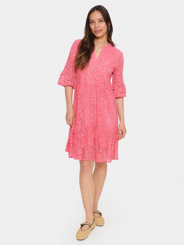 Кружевное платье Zanna с V-образным вырезом и расклешенными рукавами 3/4 элегантно и непринужденно сидит. Длина до колена обеспечивает комфорт и универсальность, подходит как для повседневного, так и для вечернего гардероба, идеально вписываясь в современный гардероб.