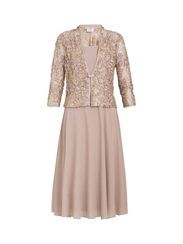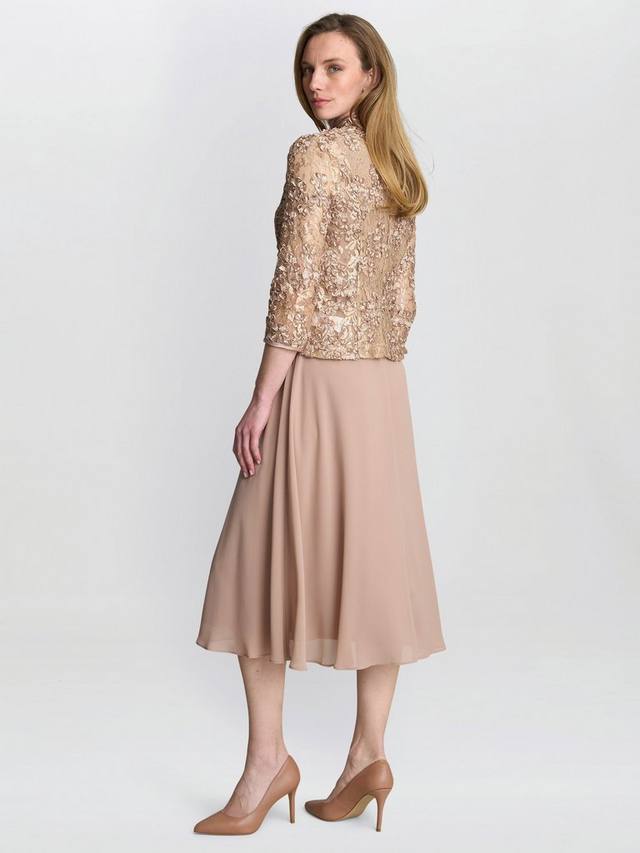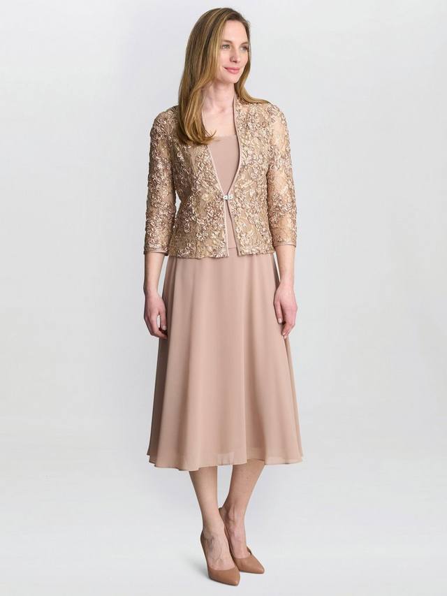 Этот прекрасный комплект состоит из мягкого, струящегося шифонового платья без рукавов в изысканном нейтральном тоне и подходящего жакета. Жакет выполнен из изысканного кружева с изящной вышивкой и изысканными украшениями, придающими образу немного блеска. Этот комплект из двух предметов гармонично сочетает мягкость и изысканность.