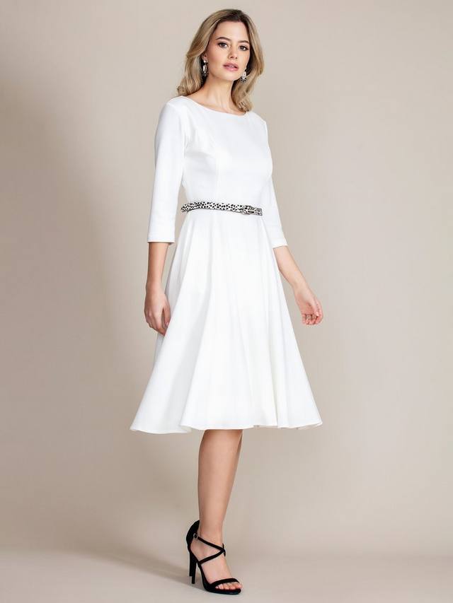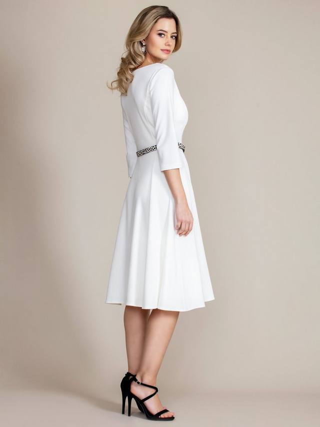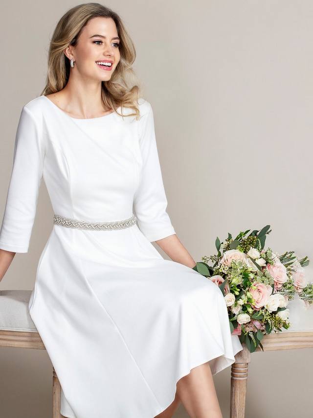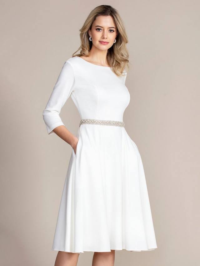 Платье Georgia с классическим вырезом лодочка и юбкой-клеш из изысканного трикотажа Ponte Roma выглядит и ощущается просто роскошно. Эта универсальная модель, идеально подходящая по фигуре и подчеркивающая достоинства фигуры, станет вашим любимым платьем для комфорта. Платье имеет мягкий приталенный силуэт, рельефные швы на груди, боковые карманы и юбку со вставками, которая идеально струится. Гламурный рукав ¾ добавляет непринужденную изысканность, которую легко надеть для любого случая, работы или выходных.
