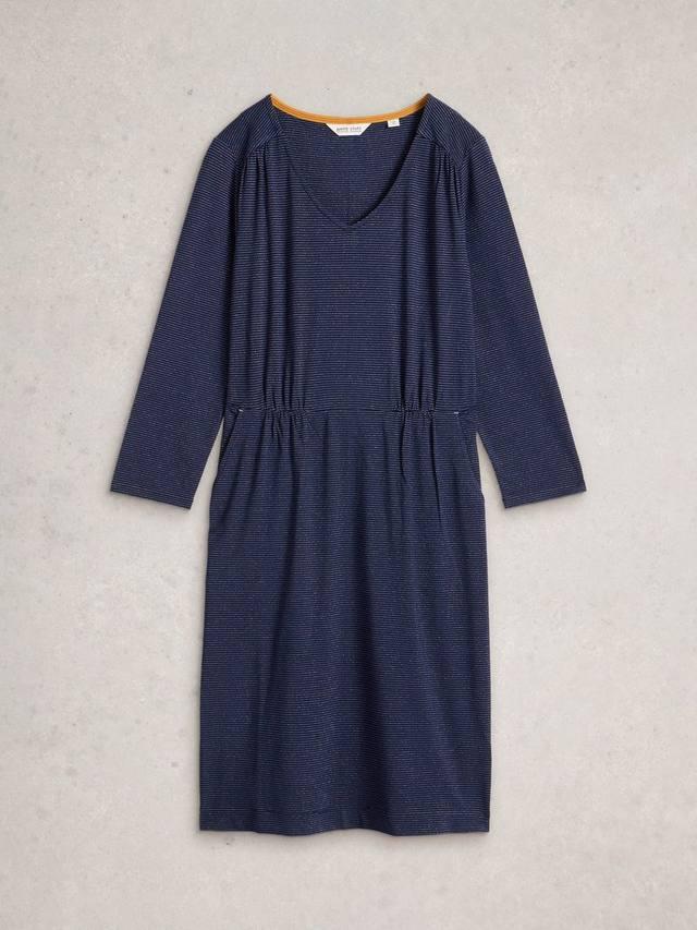 Это платье А-силуэта длиной до колена украшено элегантными полосками и лёгким мерцанием, создавая образ, который вызовет интерес. Мягкая эластичная ткань и рукава три четверти обеспечивают комфорт и уверенность в себе, как за утренним кофе, так и за вечерними встречами.