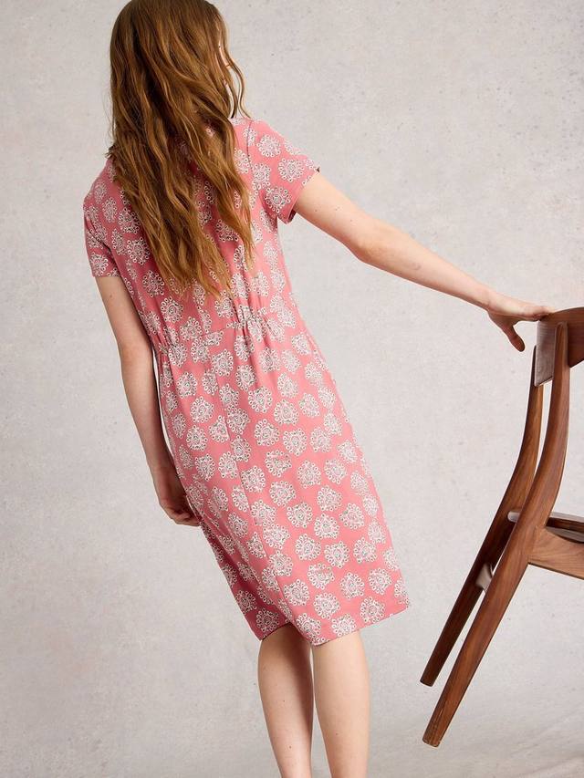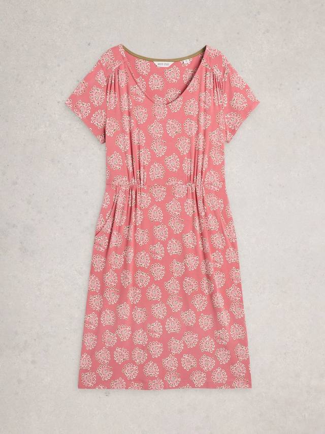Это платье длиной до колена от White Stuff, подчеркивающее талию, выполнено из смеси вискозы, что обеспечивает лёгкость. Непринуждённо облегающее фигуру благодаря непринуждённому V-образному вырезу и коротким рукавам, очаровывает непринуждённостью благодаря цветочному принту.