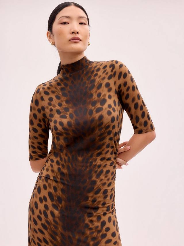 Произведите впечатление на любой встрече в этом трикотажном макси-платье. Высокий ворот и анималистичный рисунок добавят изюминку, а мягкая ткань и рукава три четверти обеспечат вам комфорт и позволят выразить свой уникальный стиль.