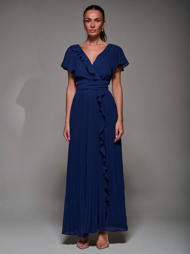 Платье из шифона с плиссировкой от Jolie Moi выполнено из нежного шифона и полностью на подкладке для комфорта. Короткие рукава с оборкой и перекрещивающийся вырез с оборкой, спускающийся по спинке. Юбка собрана в складку для изящных движений, а завязка сзади добавляет завершающий штрих.