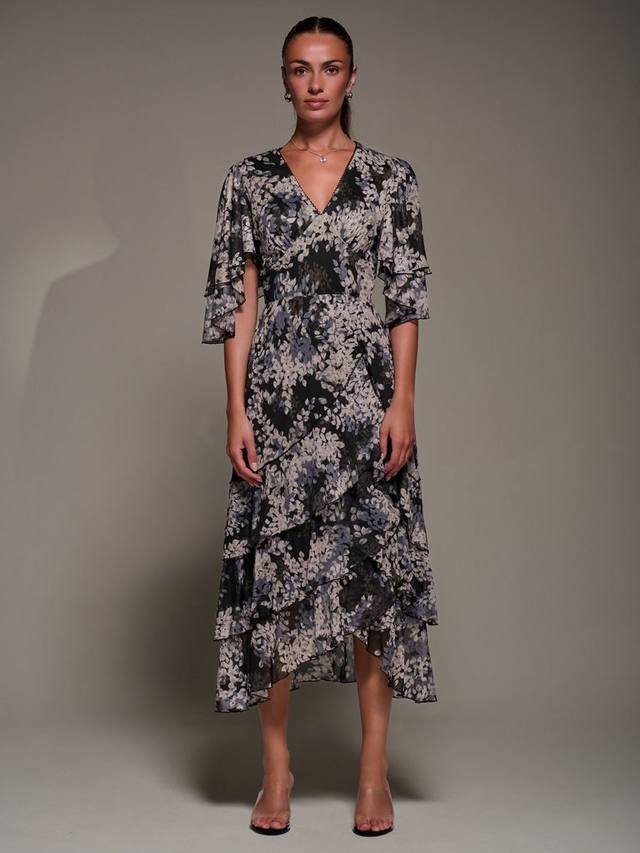 Платье-макси из сетчатой ткани с оборкой от Jolie Moi выполнено из мягкой сетчатой ткани, имеет привлекательный V-образный вырез с нежной кружевной отделкой и двухслойные короткие рукава. Присборенный бюст подчеркивает форму лифа, а тканевый пояс-завязка подчеркивает талию. Трехъярусная юбка, слегка укороченная спереди, обеспечивает грациозность движений и дополнена кружевной каймой.