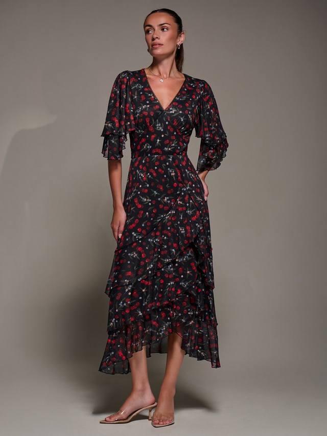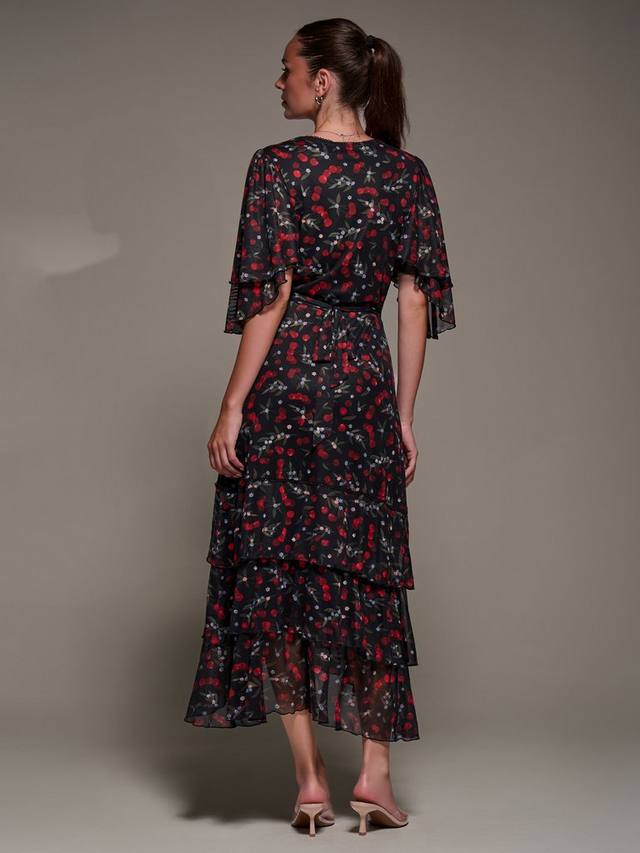 Платье-макси из сетчатой ткани с оборкой от Jolie Moi выполнено из мягкой сетчатой ткани, имеет привлекательный V-образный вырез с нежной кружевной отделкой и двухслойные короткие рукава. Присборенный бюст подчеркивает форму лифа, а тканевый пояс-завязка подчеркивает талию. Трехъярусная юбка, слегка укороченная спереди, обеспечивает грациозность движений и дополнена кружевной каймой.