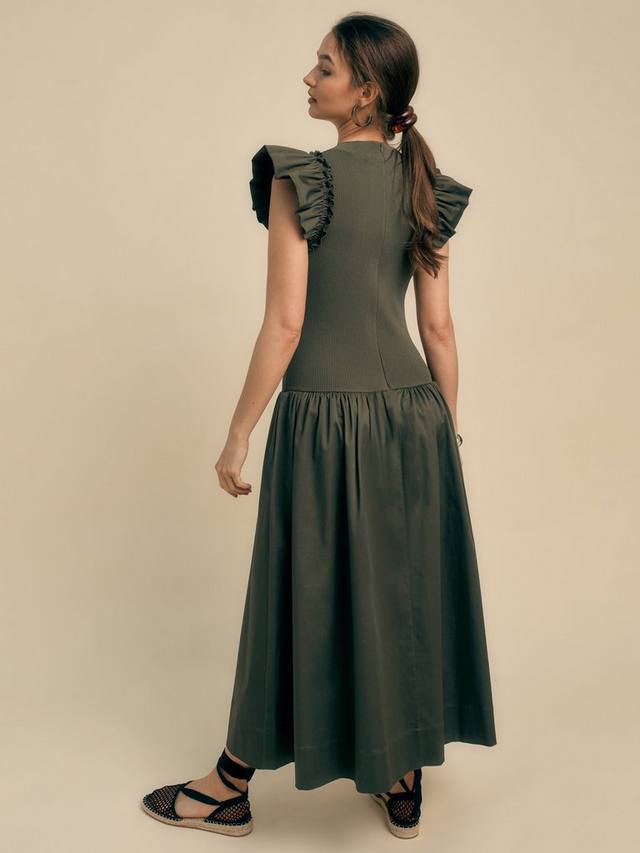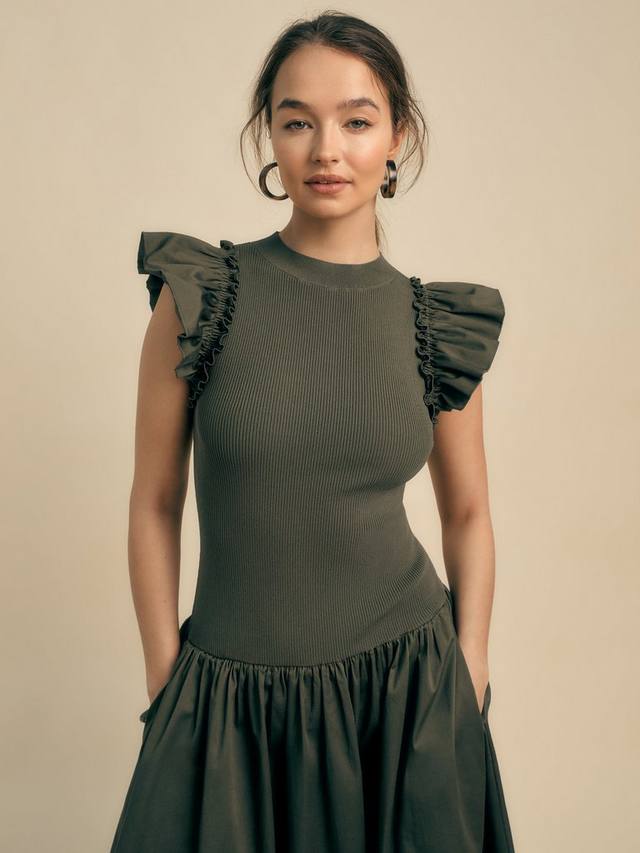 Сочетание ребристого трикотажного лифа и юбки из плотного хлопка делает это платье фаворитом сезона, и, да, у него есть карманы! - Расклешенный крой - Молния сзади - Круглый вырез горловины - Рукава с оборками - Трикотажный ребристый лиф - Карманы - Длина миди.
