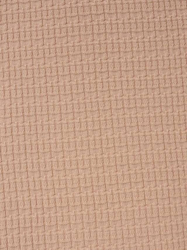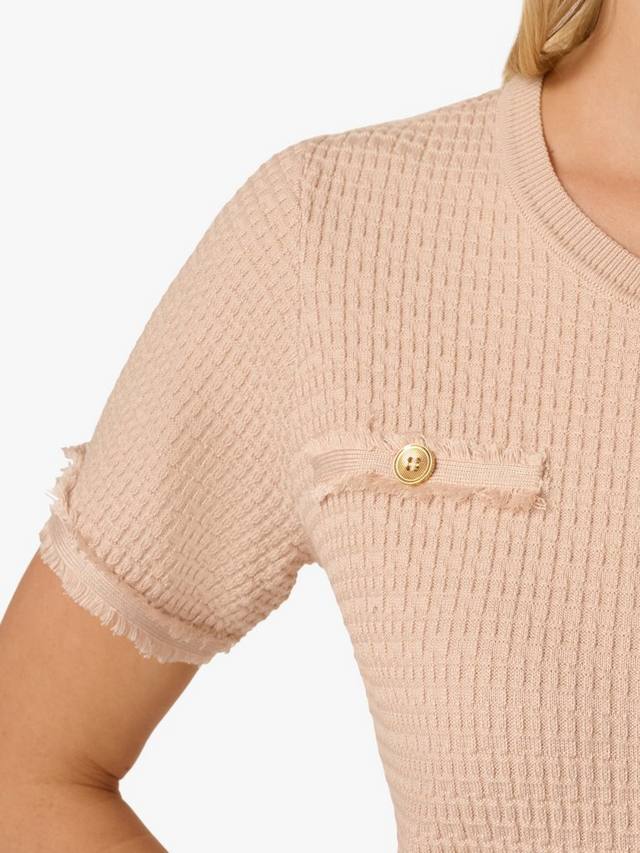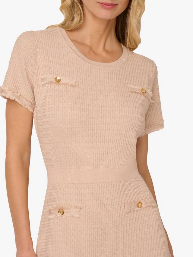 Это элегантное, но непринужденное платье миди выполнено из текстурированного трикотажа с вафельным переплетением, создающего мягкий структурированный образ. Благодаря элегантному силуэту с расклешенным лифом, коротким рукавам и нижнему краю ниже колена, платье удобно и легко носить. Манжеты и подол украшены изящной бахромой. Имитация карманов на груди и бедрах дополнена металлическими пуговицами, что придает ему роскошный вид. Это платье сочетает в себе комфорт и изысканность, создавая простой офисный образ или изысканный образ для отдыха на выходных.