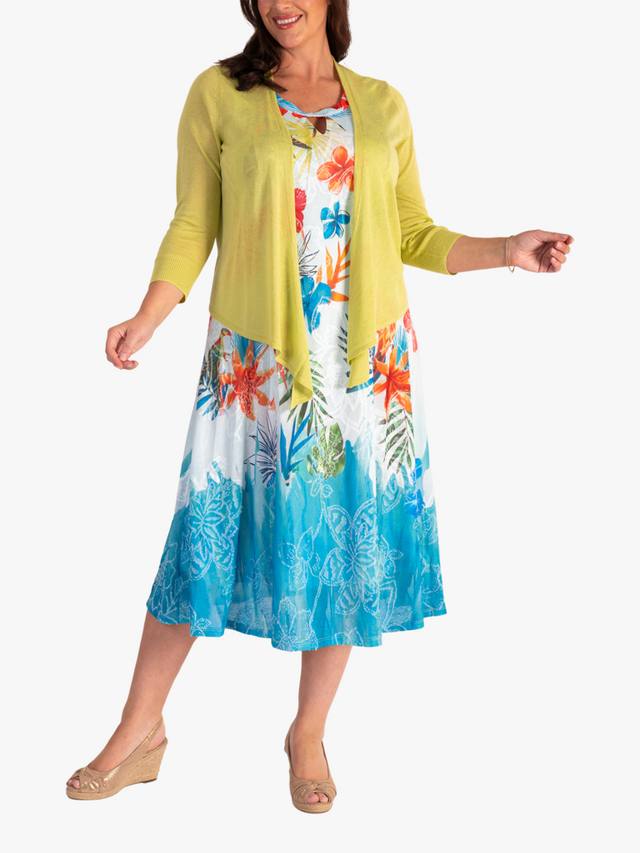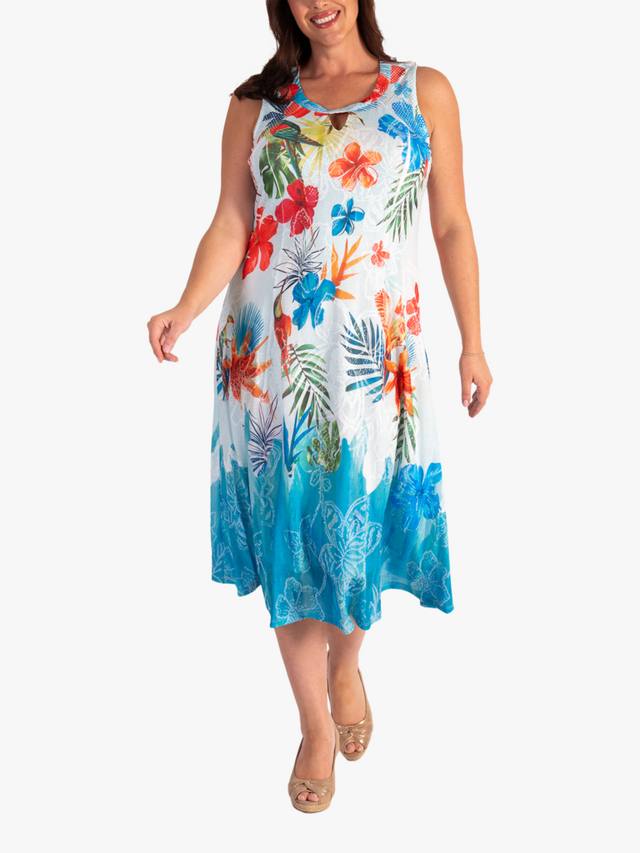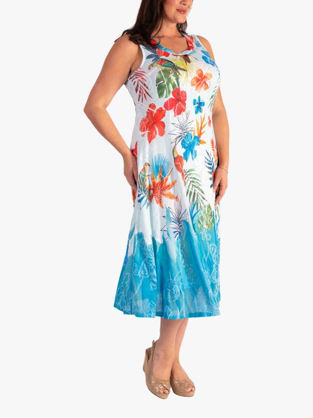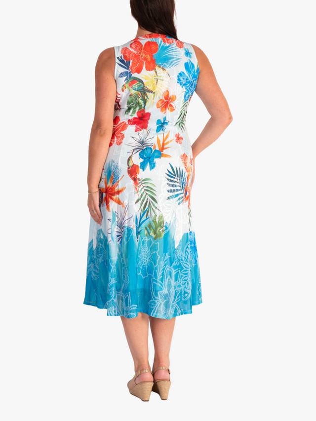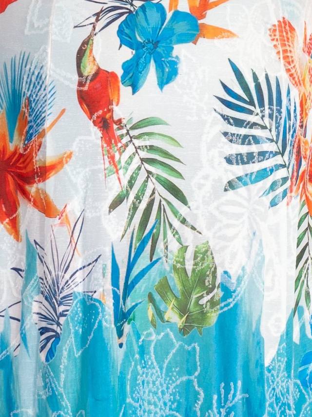 Это платье миди простого А-образного силуэта сшито из удобной и дышащей ткани для удобства ношения. Эта модель без рукавов с круглым вырезом и современными вырезами на горловине украшена привлекательным жаккардовым принтом в виде экзотических цветов и попугаев.