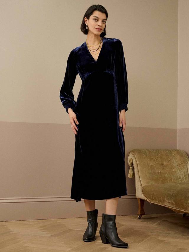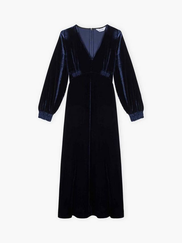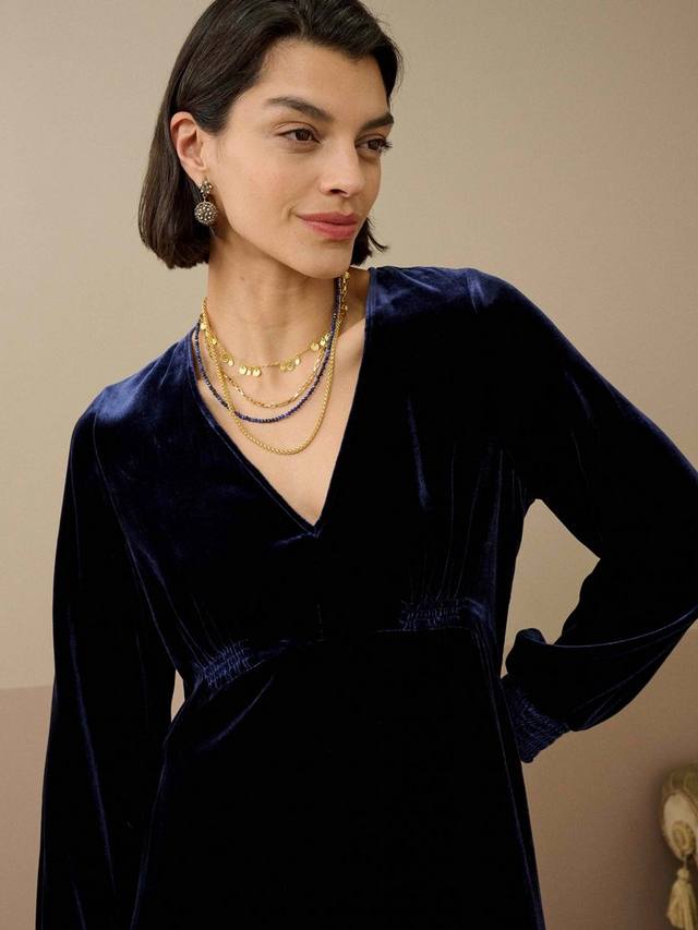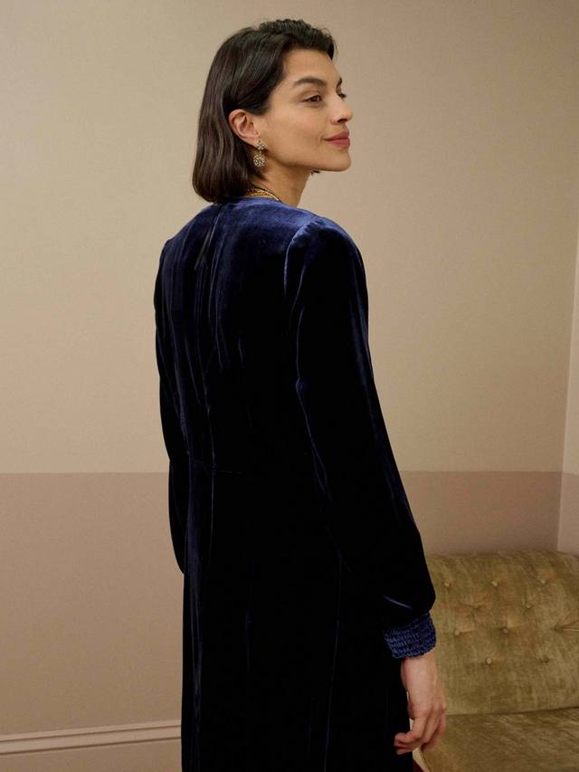 Вступите в сезон вечеринок в этом великолепном платье в стиле ампир из роскошного шелкового бархата темно-синего цвета с потайной молнией сзади, привлекательным глубоким V-образным вырезом и сборками на манжетах и талии спереди.