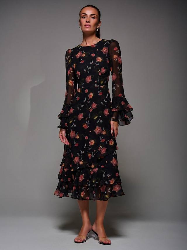 Платье из шифона с оборкой от Jolie Moi с круглым вырезом спереди и V-образным вырезом сзади, застёгивающимся на потайную молнию и завязку. Платье дополнено двойными рукавами с оборками и трёхъярусным подолом, а также двумя функциональными карманами для дополнительной практичности. Идеально подходит для любого особого случая.