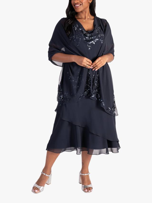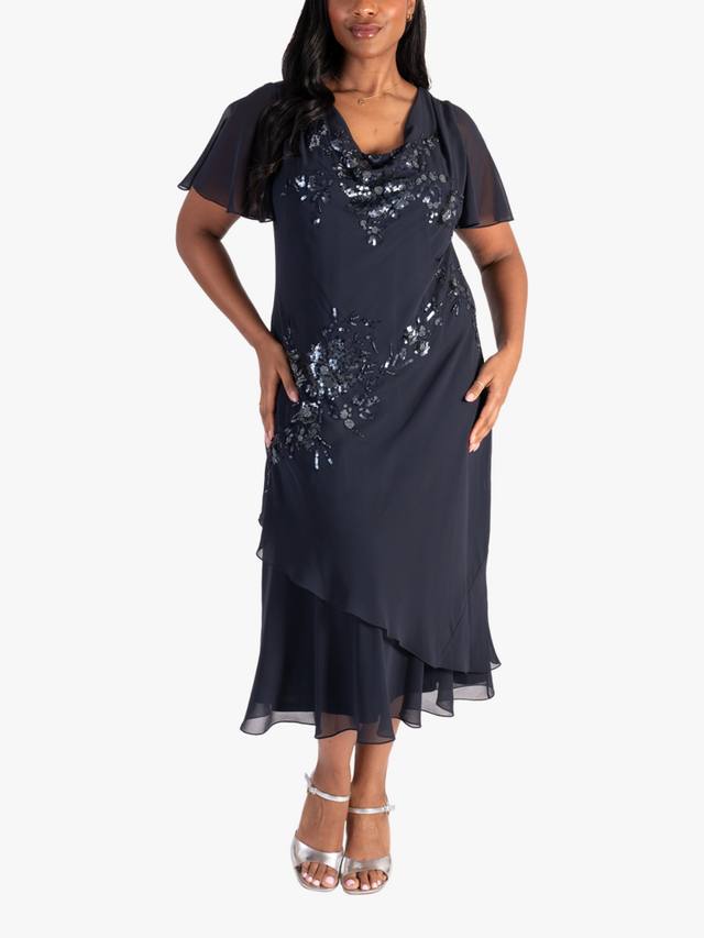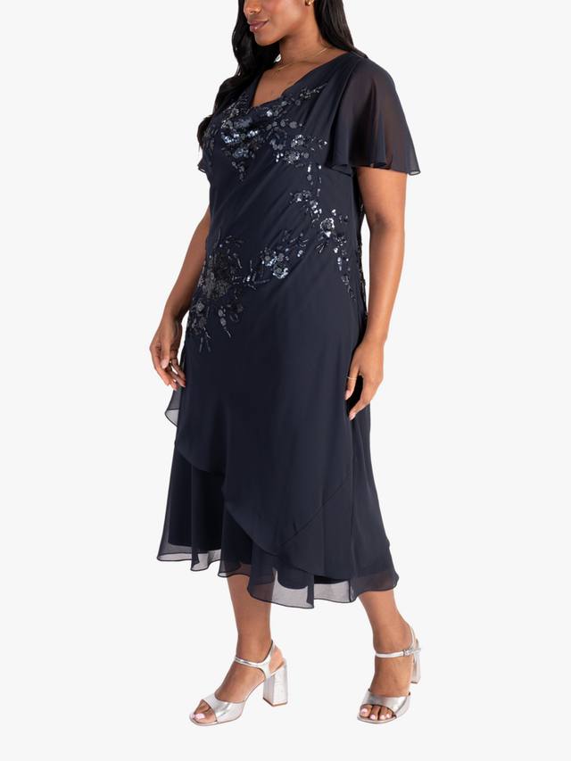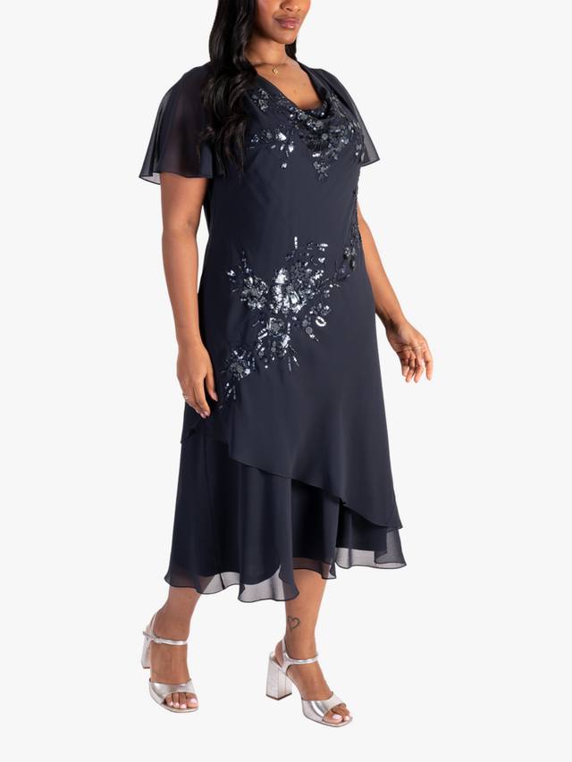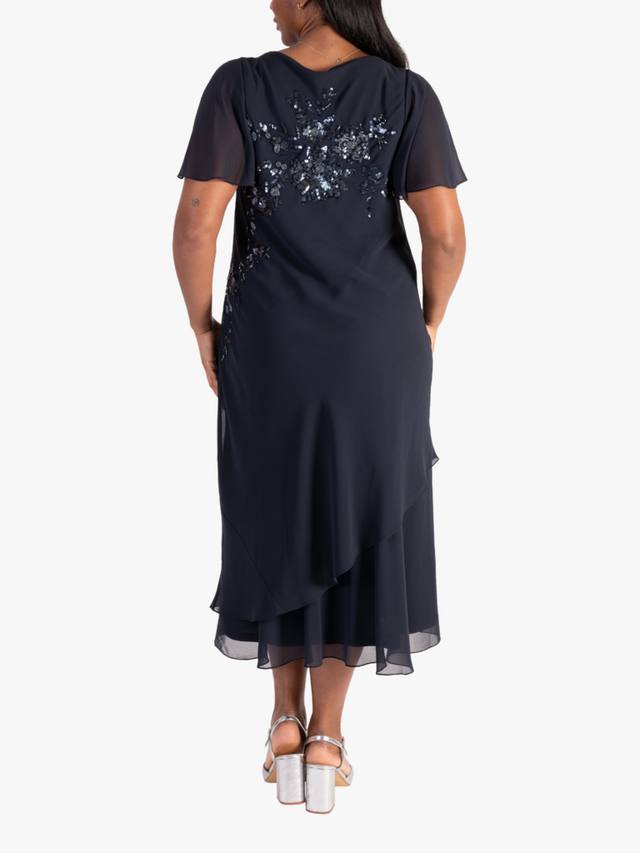 Это расшитое бисером платье от chesca, выполненное из струящейся шифоновой ткани и украшенное каскадным цветочным узором из матовых пайеток, станет элегантным вариантом для свадеб и особых мероприятий. Многослойная юбка с воротником-хомутиком и женственными рукавами-ангелочками имеет выгодно подчеркивающие фигуру швы, придающие ей элегантный вид.
