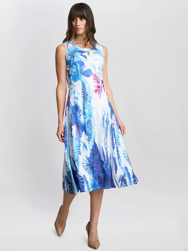 Это летнее платье без рукавов украшено ярким цветочным рисунком, который придаёт ему свежесть и летний вид. Платье имеет красивый А-образный силуэт, струящийся и удобный в носке. Лёгкая ткань подчёркивает его непринуждённую элегантность. Круглый вырез сохраняет классический вид, а эффектный принт добавляет современный и яркий штрих.