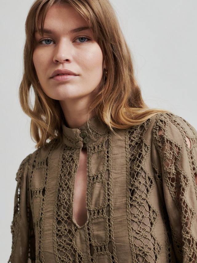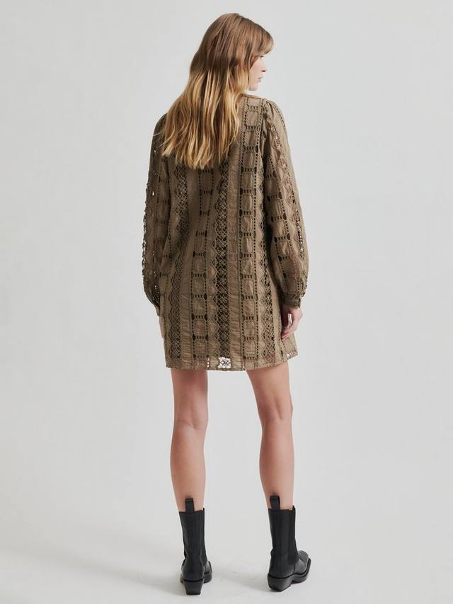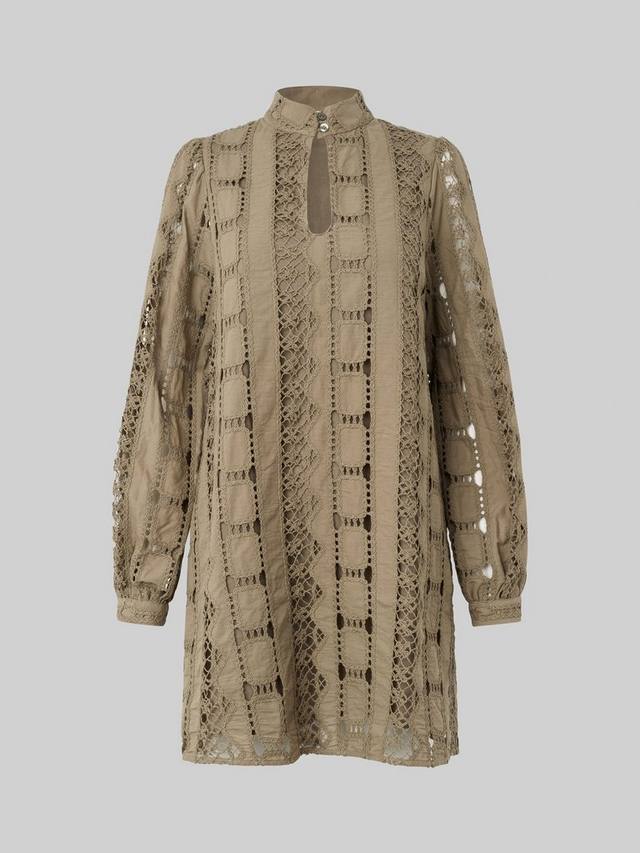 Платье выполнено из лёгкого и гладкого хлопка, напоминающего вязаный крючком. Спереди вырез-замочная скважина, застёгивающийся на пуговицу и петлю сверху. Присборенные плечи, длинные рукава и манжеты на пуговицах. Свободный прямой крой.