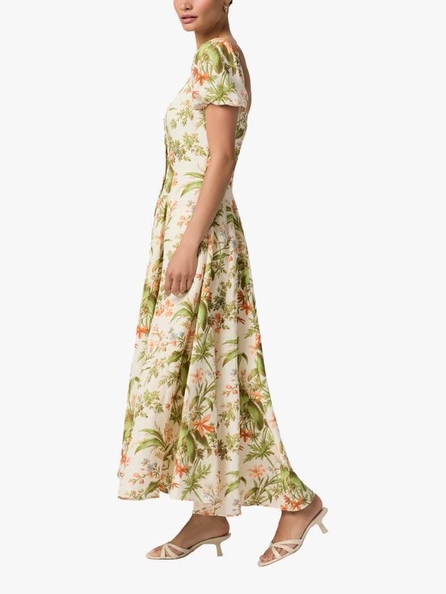 Lindi выполнена из роскошной мягкой смеси шелка и льна с кремово-белой основой и зеленым цветочным принтом с тропическим, ботаническим оттенком.