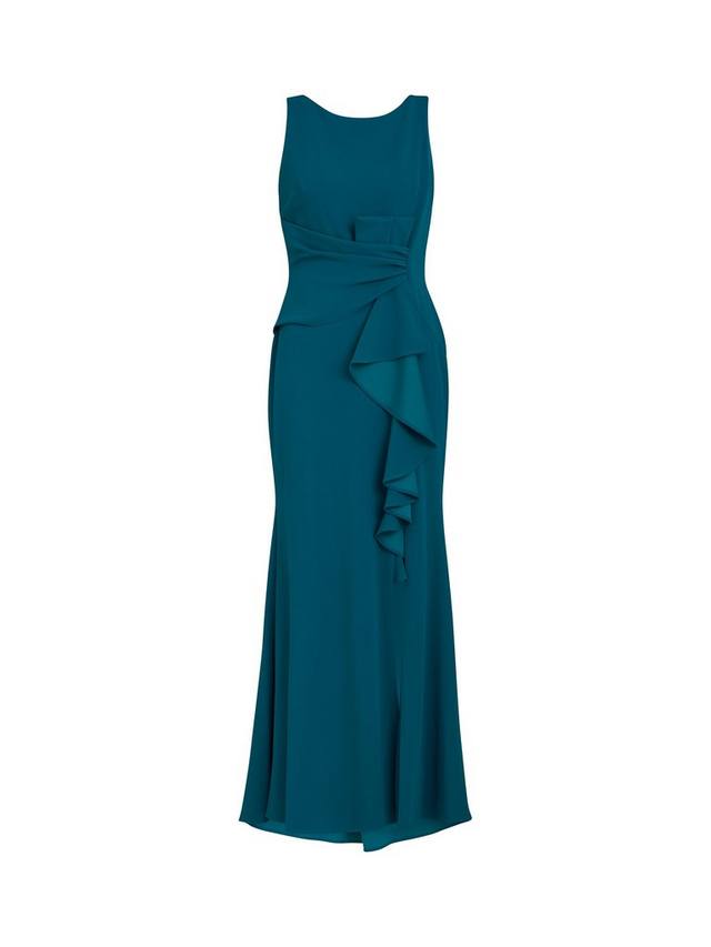 Это элегантное, изысканное и непринужденно стильное платье выполнено из мягкой креповой ткани. Это макси-платье без рукавов имеет строгий лиф и эффектную драпировку на талии, переходящую в оборку вдоль юбки. Небольшой разрез сбоку добавляет движения и идеально подходит для любого торжественного случая.