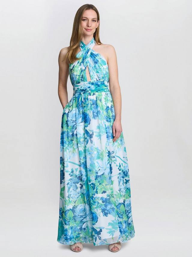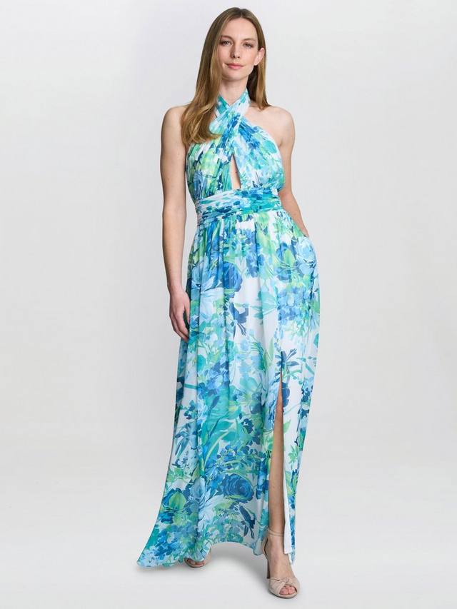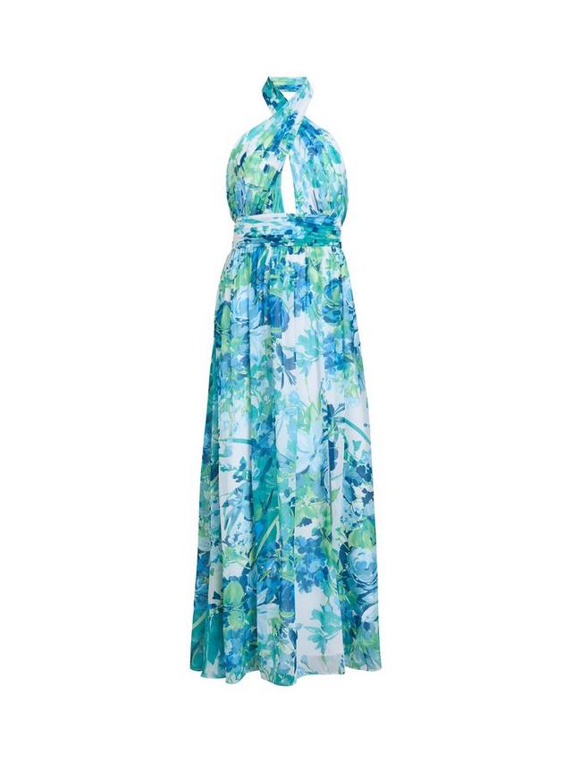 Великолепное платье с потрясающим халтером, выполненное из струящегося шифона. Платье украшено красивым абстрактным цветочным принтом. Халтер красиво подчеркивает плечи, а приталенный пояс создает изящный силуэт. Идеально подходит для летних мероприятий и свадеб.