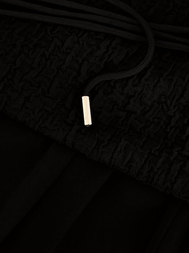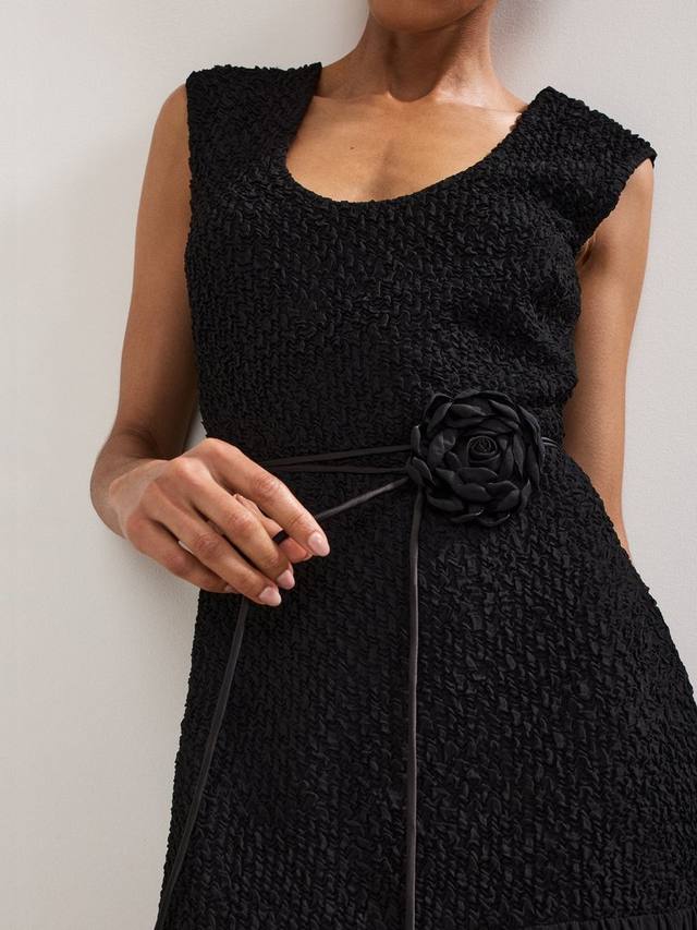 Черное платье для торжественных случаев, которое непременно привлечет всеобщее внимание. Лиф из фактурной эластичной ткани плавно переходит в юбку, которая неподвластна времени. Платье дополнено уникальным квадратным вырезом и съемным поясом, украшенным изысканным цветочным узором. Создайте монохромный образ с помощью черных аксессуаров или разнообразьте его яркими акцентами.