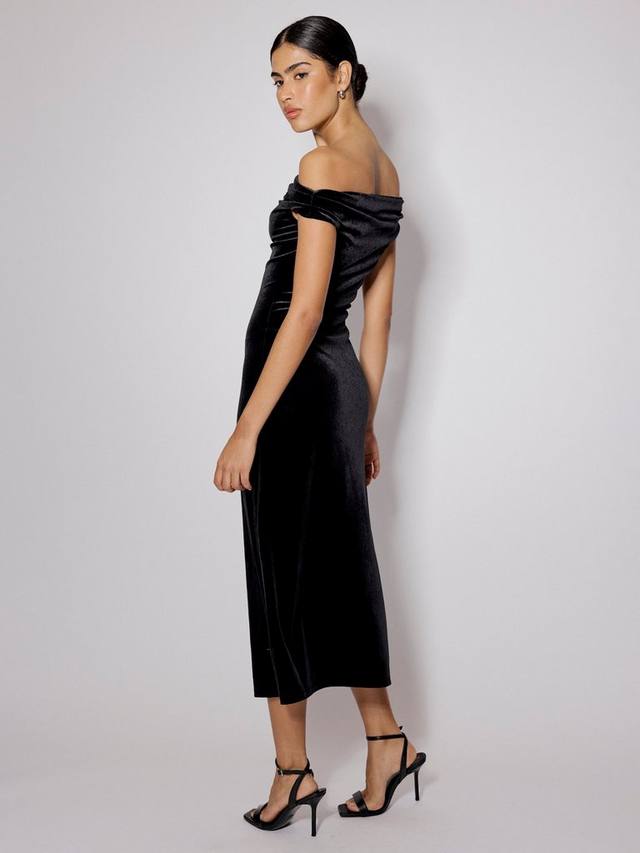 Это мягкое бархатное макси-платье с открытыми плечами. Нам нравится его непринужденный облегающий силуэт, который струится по телу.