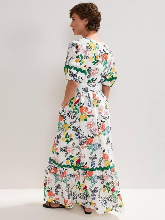 Представляем платье Rochella, украшенное принтом в сицилийском стиле, который гарантированно привлечёт внимание. Женственные рукава-фонарики придают макси-силуэту лёгкий объём, а отделка в виде бисера добавляет современный штрих. В сочетании с вашими любимыми сандалиями эта модель создаст непринуждённый и шикарный образ для летнего отдыха.