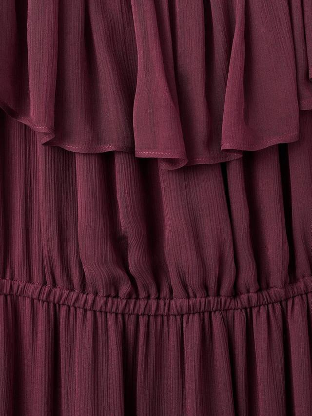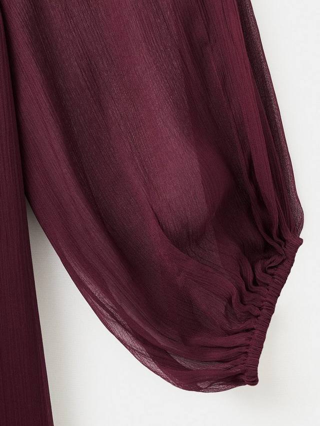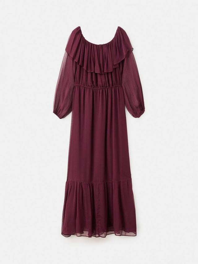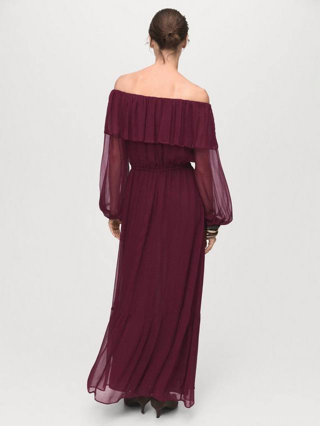 Это длинное платье с длинными рукавами от Mango, отделанное воланами, имеет вырез бардо и универсальный простой дизайн.