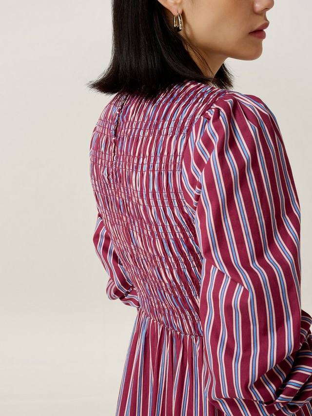 Платье макси Saint, которое идеально подходит как для работы, так и для отдыха на выходных, создаёт эффектный силуэт, не жертвуя комфортом. Платье выполнено из мягкого хлопка с полосатым принтом, с лифом на сборках и длинными рукавами-фонариками.