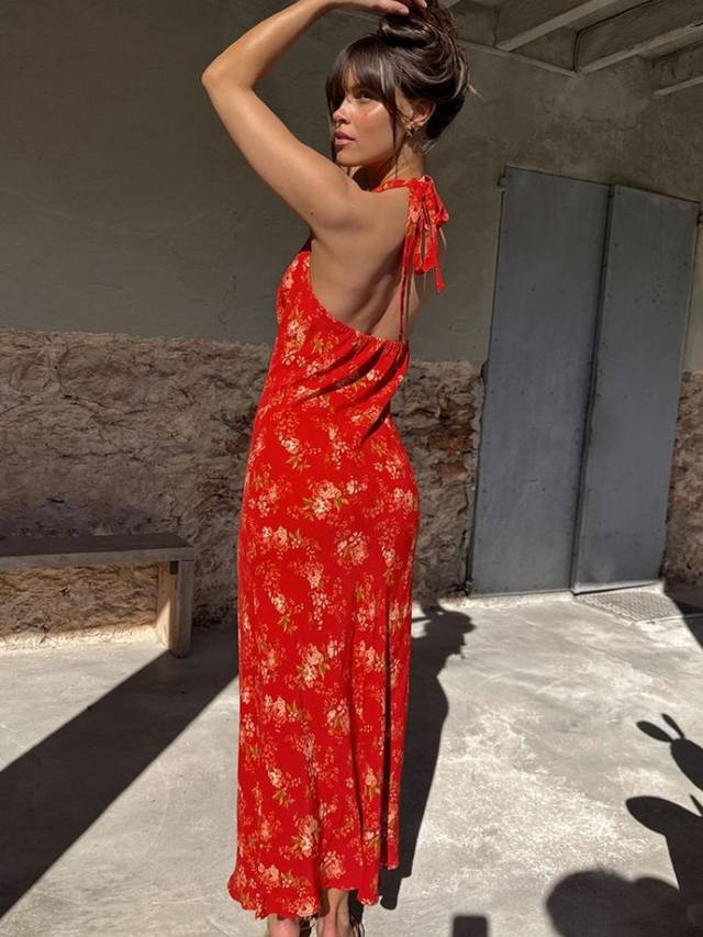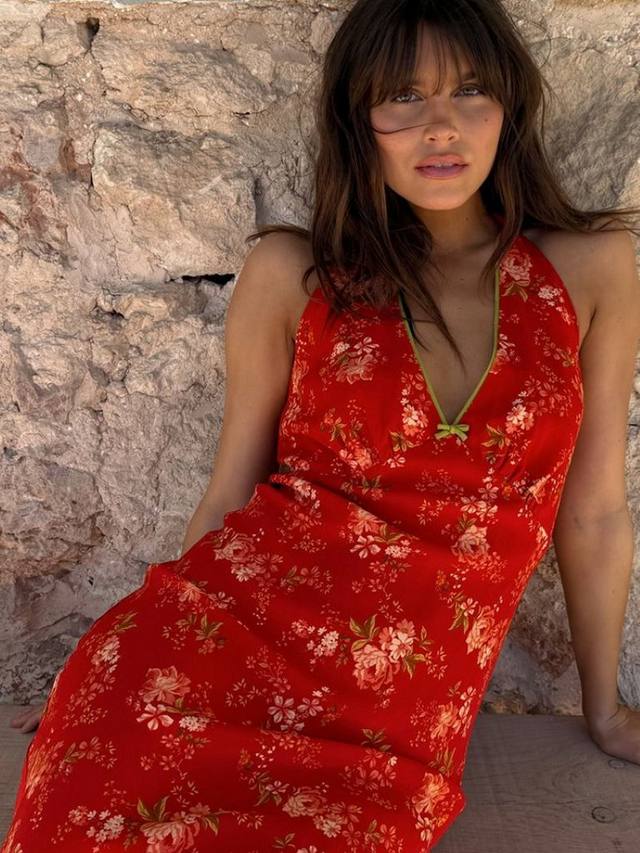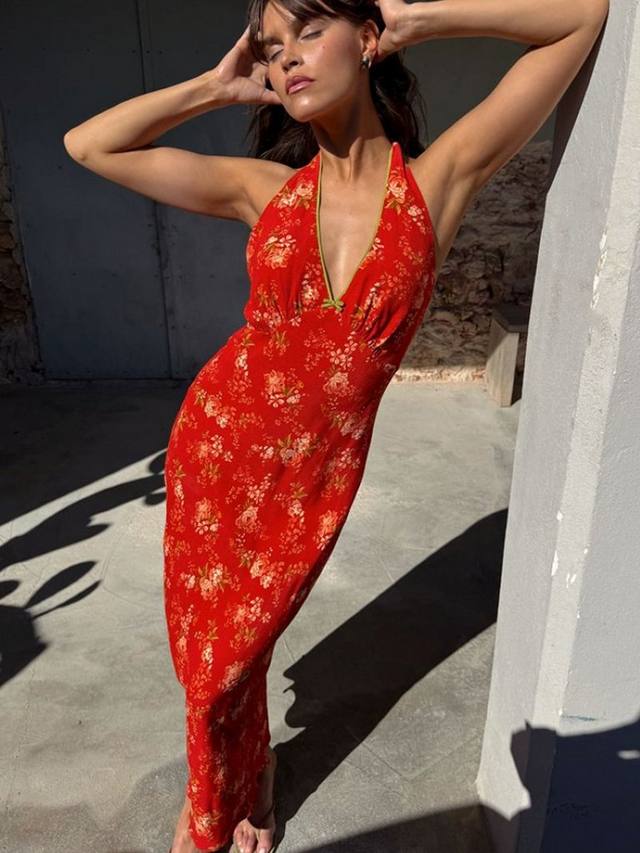 Легкая бретелька через шею идеально подходит для летних европейских вечеров. Винтажный цветочный принт в розовых и зеленых тонах в сочетании с зеленой отделкой и бантом вдоль выреза на темно-красной основе сделает этот топ вашим фаворитом следующего лета.