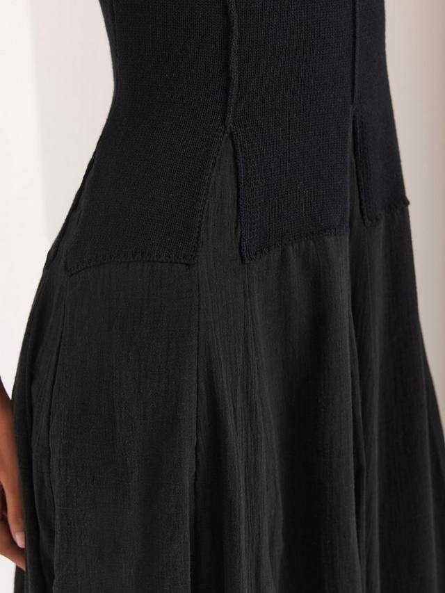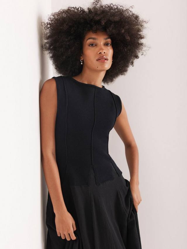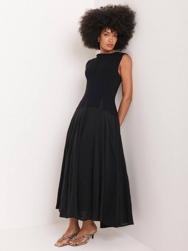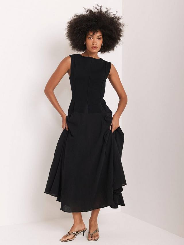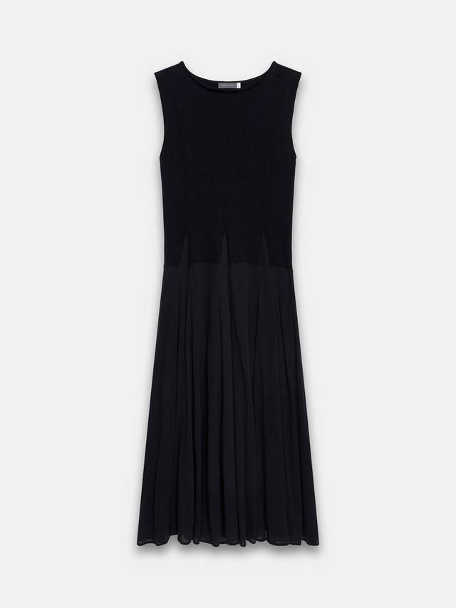 Платье без рукавов макси-силуэта с круглым вырезом и разрезом на талии.