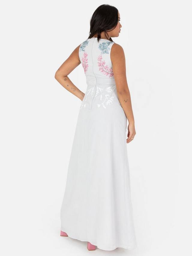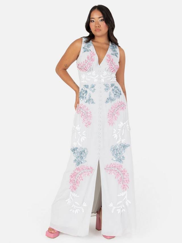 Это потрясающее макси-платье, известное своей изысканной сложностью, поражает изысканными деталями. Платье особенно эффектно смотрится благодаря изысканной отделке бисером и пайетками, образующими цветочные мотивы. Лиф без рукавов также имеет элегантный V-образный вырез, мягкие линии груди и талии, а также имитацию пуговиц, идущую от выреза до разреза юбки. Длина макси этого эффектного платья позволила дизайнерам воплотить современный А-образный силуэт с разрезом спереди, придав этому стилю смелую нотку.