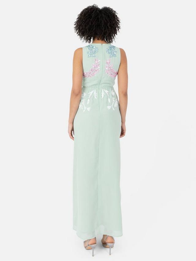 Это потрясающее макси-платье, известное своей изысканной сложностью, поражает изысканными деталями. Платье особенно эффектно смотрится благодаря изысканной отделке бисером и пайетками, образующими цветочные мотивы. Лиф без рукавов также имеет элегантный V-образный вырез, мягкие линии груди и талии, а также имитацию пуговиц, идущую от выреза до разреза юбки. Длина макси этого эффектного платья позволила дизайнерам воплотить современный А-образный силуэт с разрезом спереди, придав этому стилю смелую нотку.