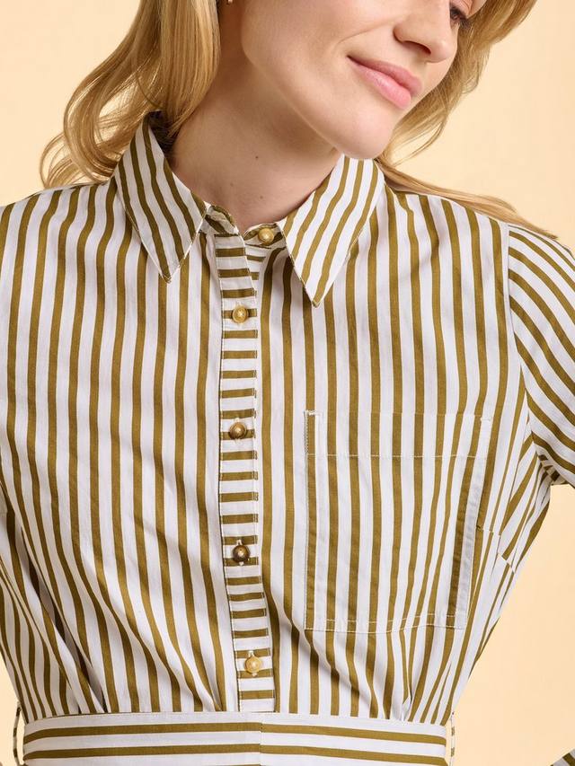 Это платье, представляющее собой обновленную версию традиционного полосатого макси, предлагает строгий крой, идеально подходящий как для повседневной носки, так и для повседневной носки. Пояс в полоску, который подчеркивает талию, создавая эффектный расклешенный силуэт, а также воротник, манжеты и пуговицы в стиле рубашки и черепаховые пуговицы – в этом платье главное внимание уделяется деталям.
